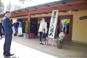 どのお友だちも楽しみに待っていた幼稚園への入園、少し緊張気味でしたが、みんなうれしそうで、ニコニコ顔です。おとうさん、おかあさんに付き添われて元気に登園してきました。おじいちゃん、おばあちゃんの顔も大勢見られました。玄関先で、園長先生をはじめ大勢の先生方に「おめでとう」と迎えられて、園舎に入りました。
