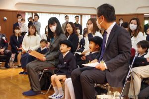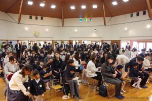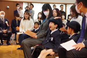 入園式では、新入園児は保護者と一緒に式場に入場しました。新入園児の紹介では、「○○組の皆さん!」と先生に呼ばれると、「はーい!」とみんな元気に手をあげて、答えることができました。