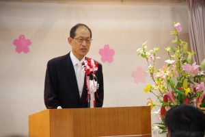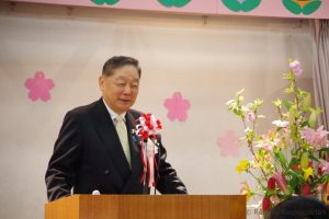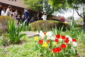 4月13日(木)、幼稚園遊戯室で入園式が行なわれました。新入園児をお祝いするかのようにチューリップが赤、白、黄色と色とりどりの花を咲かせて、春の香りいっぱいの幼稚園です。年長さん3名、年中さん1名、年少さん31名の合計35名の園児が入園し、満3歳児からの進級児20名も一緒に入園式に参列しました。