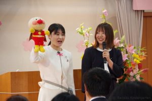 式典の途中、新入園児をお祝いして、幼稚園の先生とパペットが登場してきて、みんなに歓迎のご挨拶をしました。