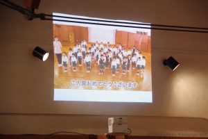年長さんからの新入園児を迎えるビデオメッセージが上映され、幼稚園の仲間入りしたお友だちを心から歓迎しました。