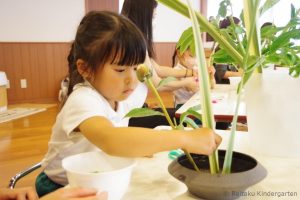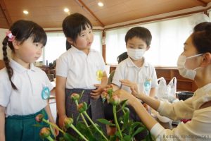 子ども達それぞれに個性的な作品が出来上がって子ども達も満足げです。使用したお花はそれぞれご家庭に持ち帰っていただきました。