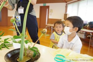 当日は目の前に並んだ綺麗なお花や葉っぱを目の前にして目をキラキラさせて嬉しそうな子ども達、先生に活け方の形を教わったら、ハサミを使って思い思いにいけばなを楽しみました。