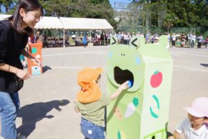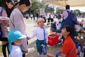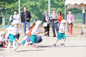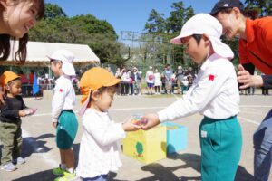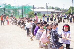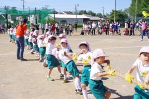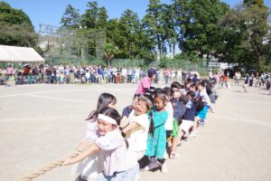 未就園児のお友だちや満3歳児保育りんご組やみかん組のお友だちは保護者の方々と一緒にかけっこを行い、卒園児のお兄さんお姉さんによる綱引きも行われました。