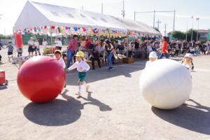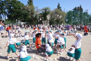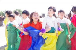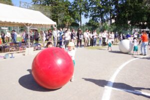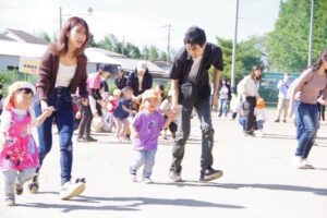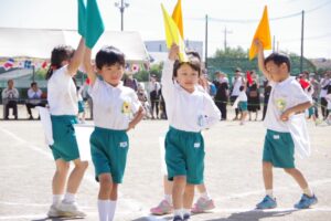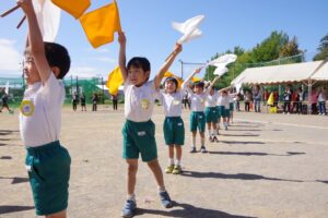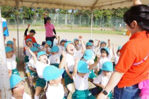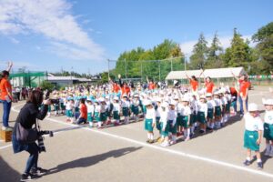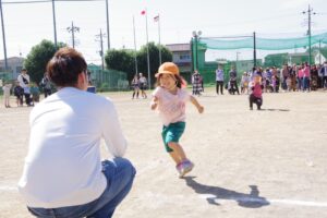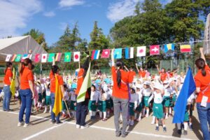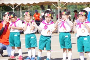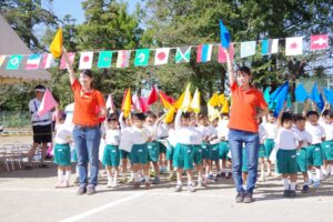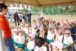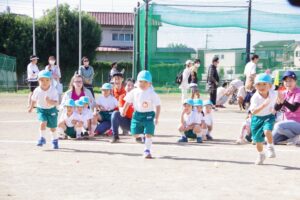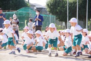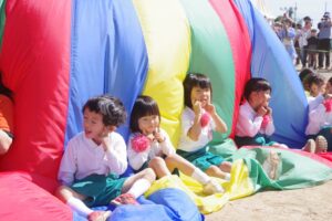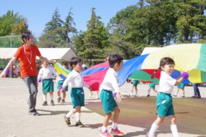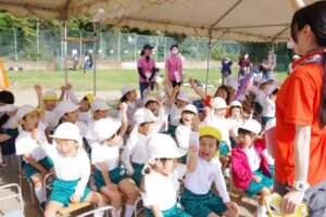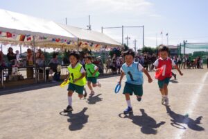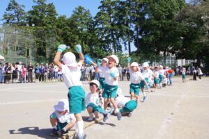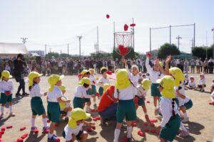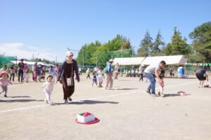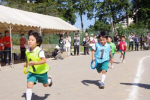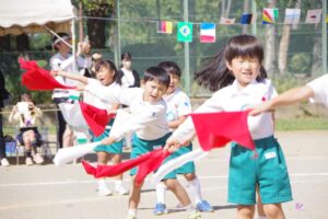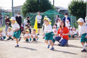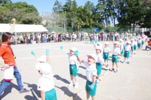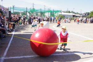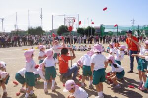 お父さん、お母さん、おじいちゃん、おばあちゃんを始めとして家族の皆さんが応援に駆けつけ、張り切る子ども達。学年ごとにかけっこ、全学年で玉入れ、年少組はお遊戯、年中組はバルーン、大玉転がし、年長組は旗体操とリレー、綱引きが行われました。