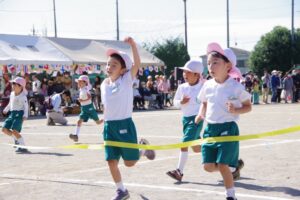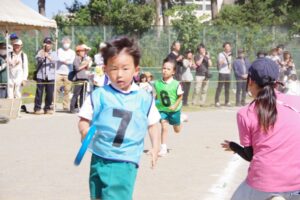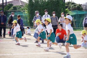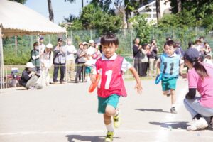 お遊戯では子ども達の入場から、バルーンでは、技が決まるたびに、旗体操では、子どもたちの凛々しい姿に保護者の方々も感動され、沢山の拍手をいただきました。最後に年長さんのクラス対抗リレー競争が行われ、会場全体が追いつ抜かれつの競り合ったレースにより、大きな歓声につつまれました。