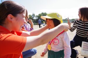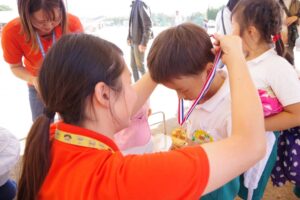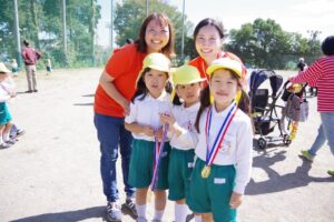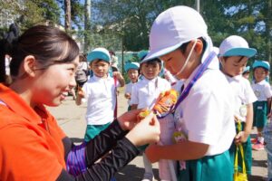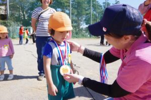 園児たちは、先生より頑張ったご褒美に、全員ピカピカの金メダルをもらってとてもうれしそうでした。どの子も誇らしげに胸にかけて、それぞれ帰宅しました。
