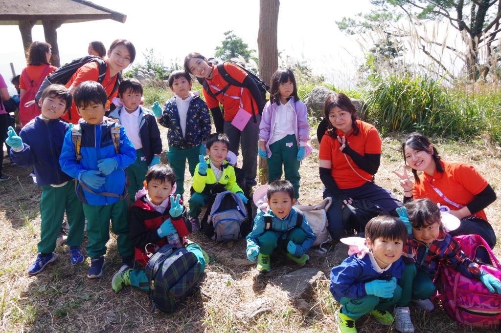 山頂ではクラスのみんなで記念写真を撮りました。自分の足で、自分たちだけで山頂に登れたということでみんなの顔は、満足感、充実感、達成感でとても生き生きしているように感じられました。