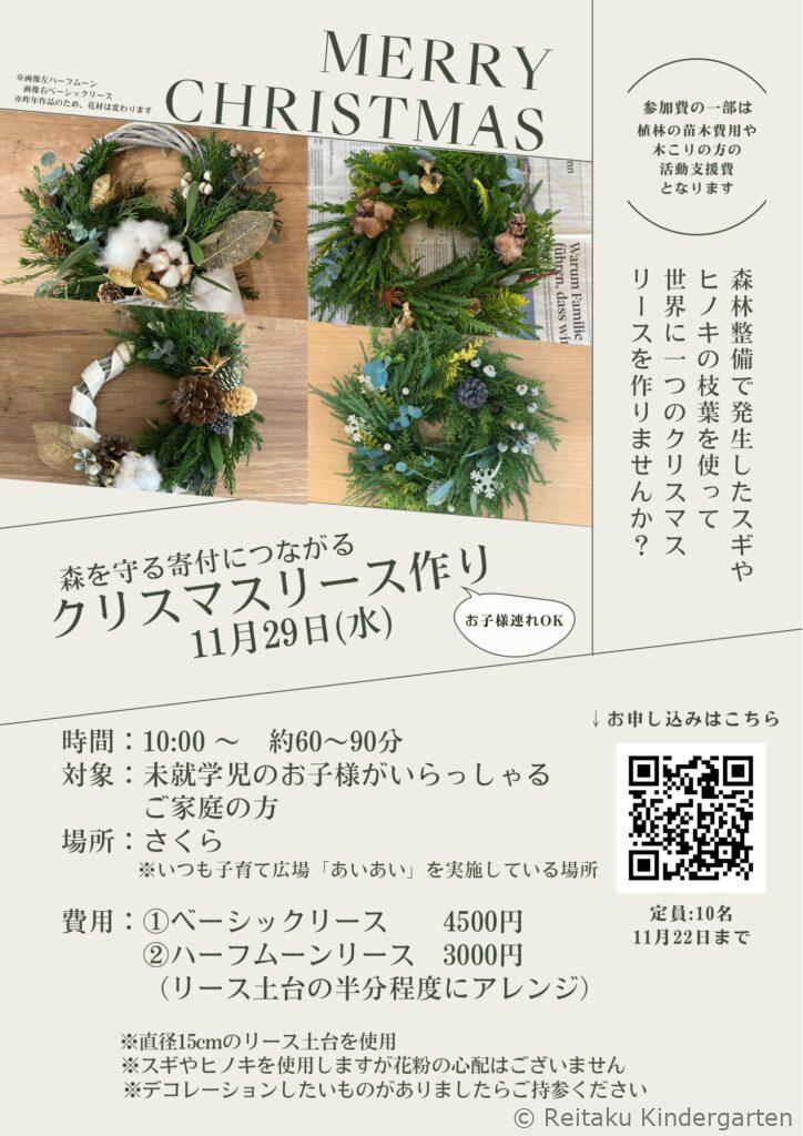 麗澤幼稚園では、11/29(水)子育て広場「あいあい」内にて「森を守る寄付につながるクリスマスリース作り」を実施致します。