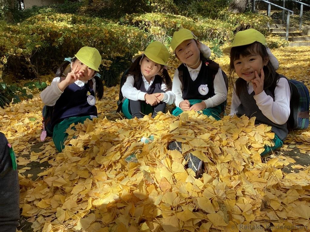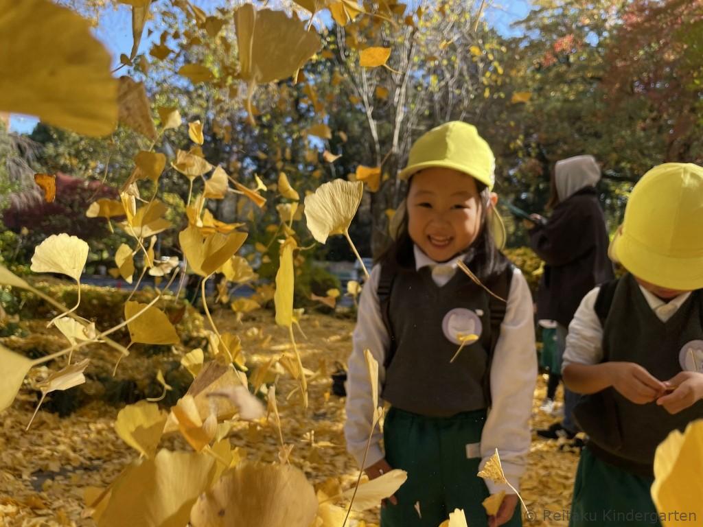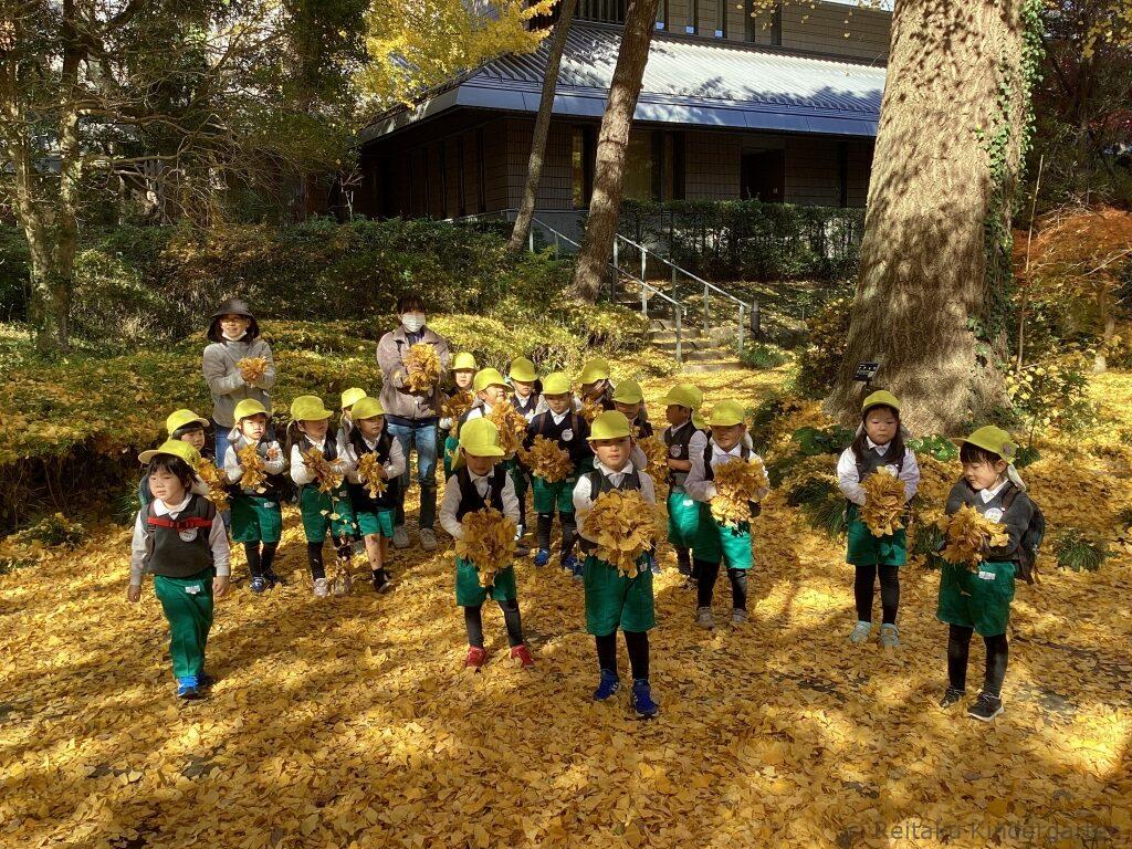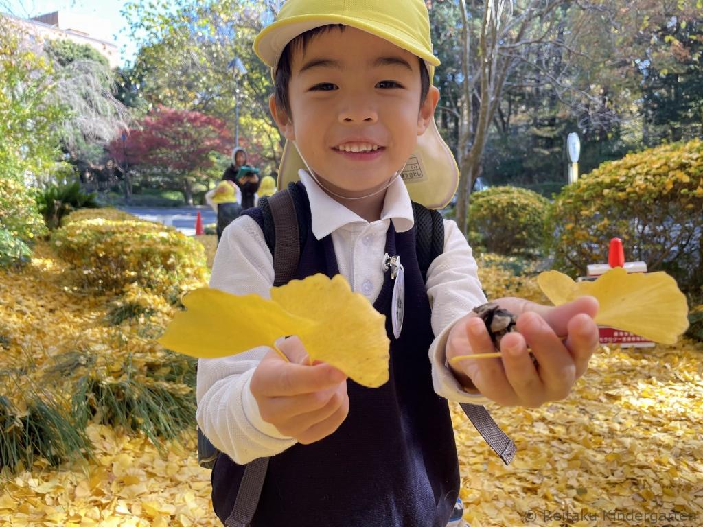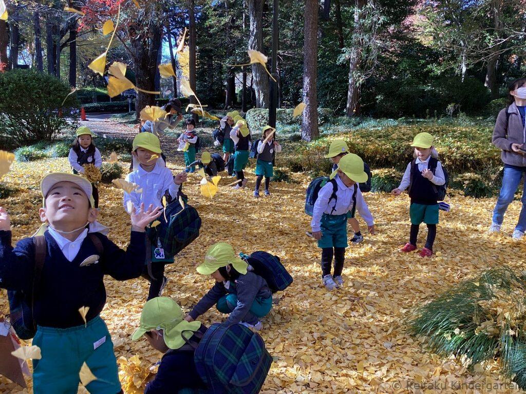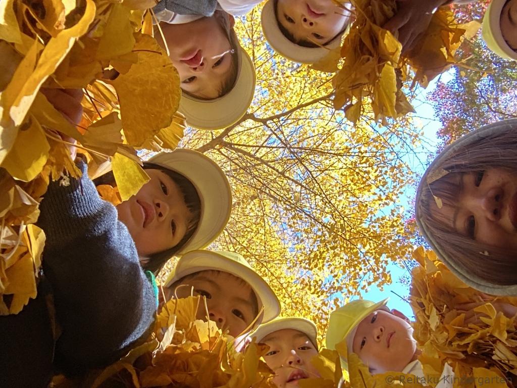 真っ赤に色づいた櫂の木や、緑、オレンジ、赤と見事なグラデーションになっているカエデ、鮮やかな黄色の絨毯を作ってくれるイチョウ等、夏に見た、緑の葉からは想像もつかないほどの変化に子どもたちもびっくりしていました。