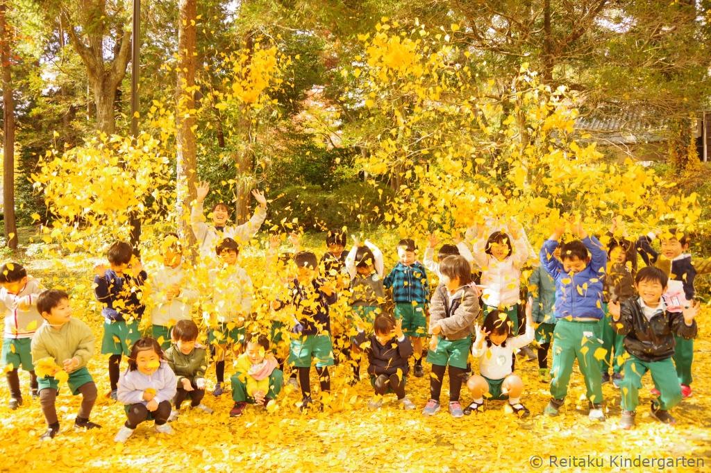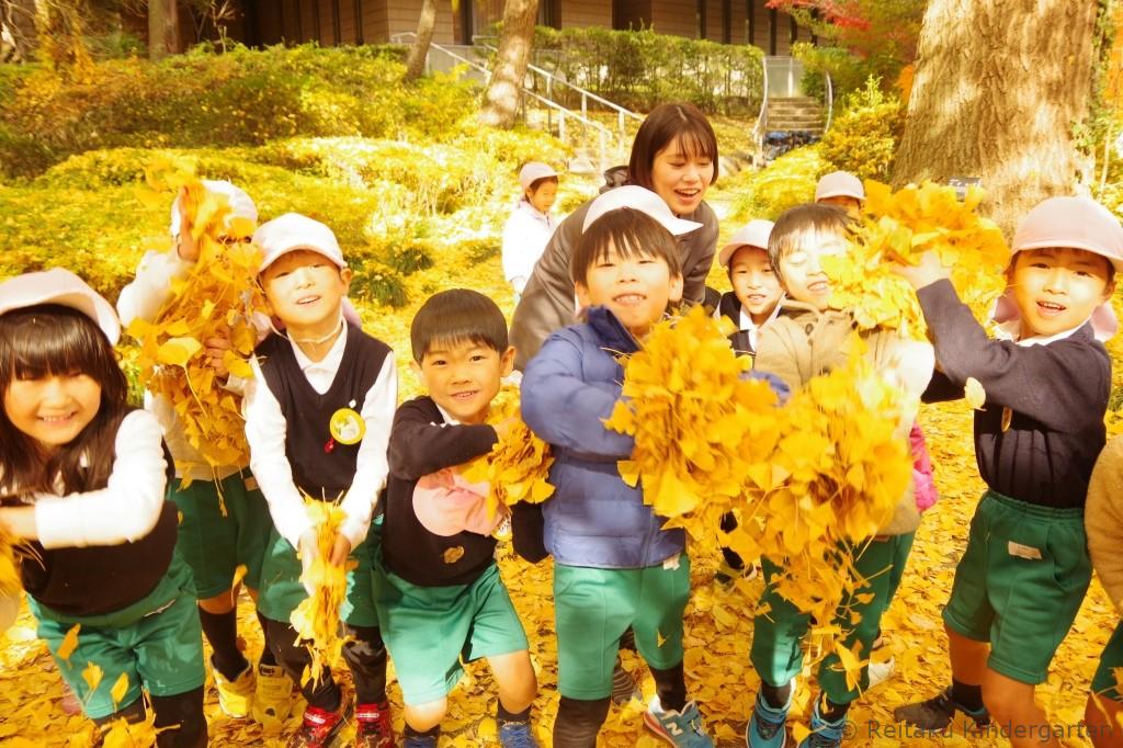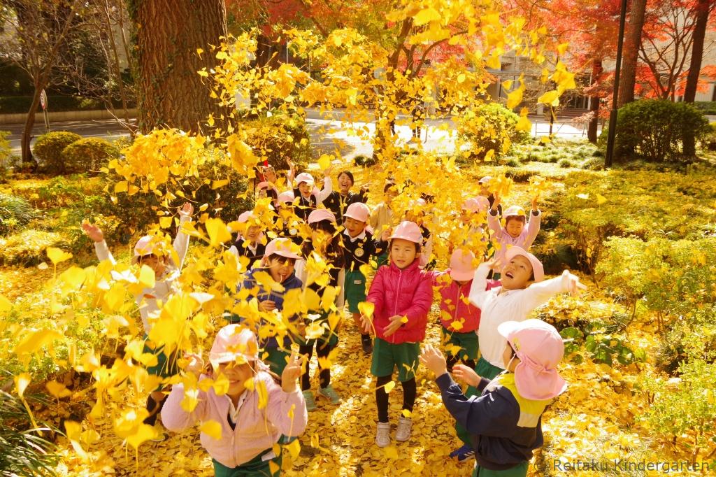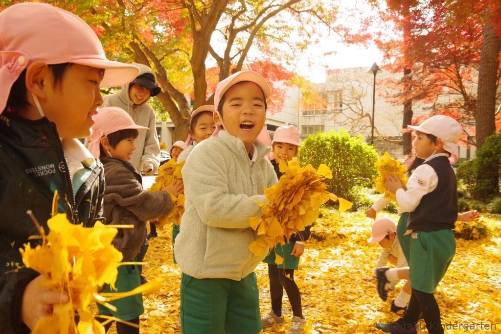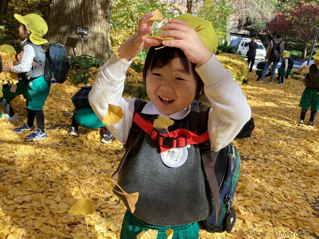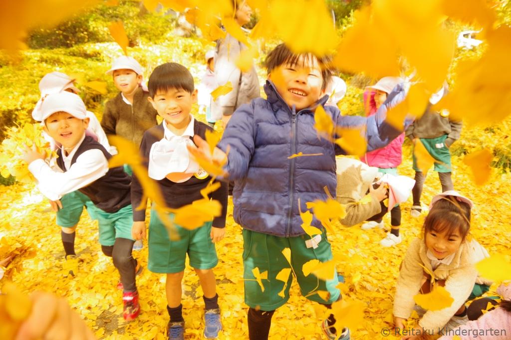 真っ赤に色づいた櫂の木や、緑、オレンジ、赤と見事なグラデーションになっているカエデ、鮮やかな黄色の絨毯を作ってくれるイチョウ等、夏に見た、緑の葉からは想像もつかないほどの変化に子どもたちもびっくりしていました。