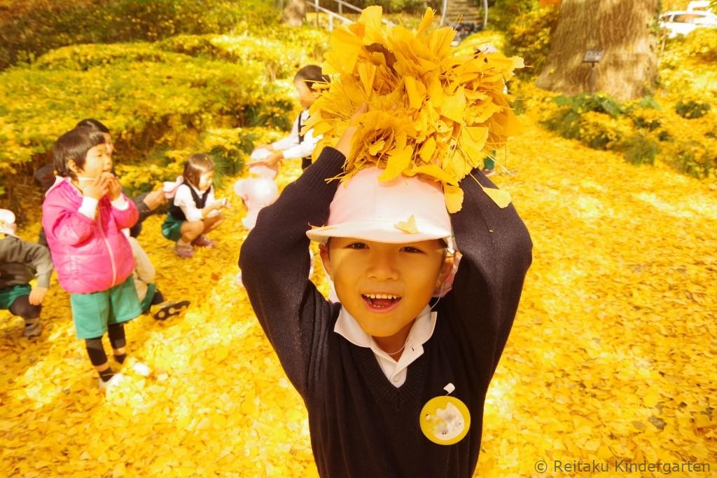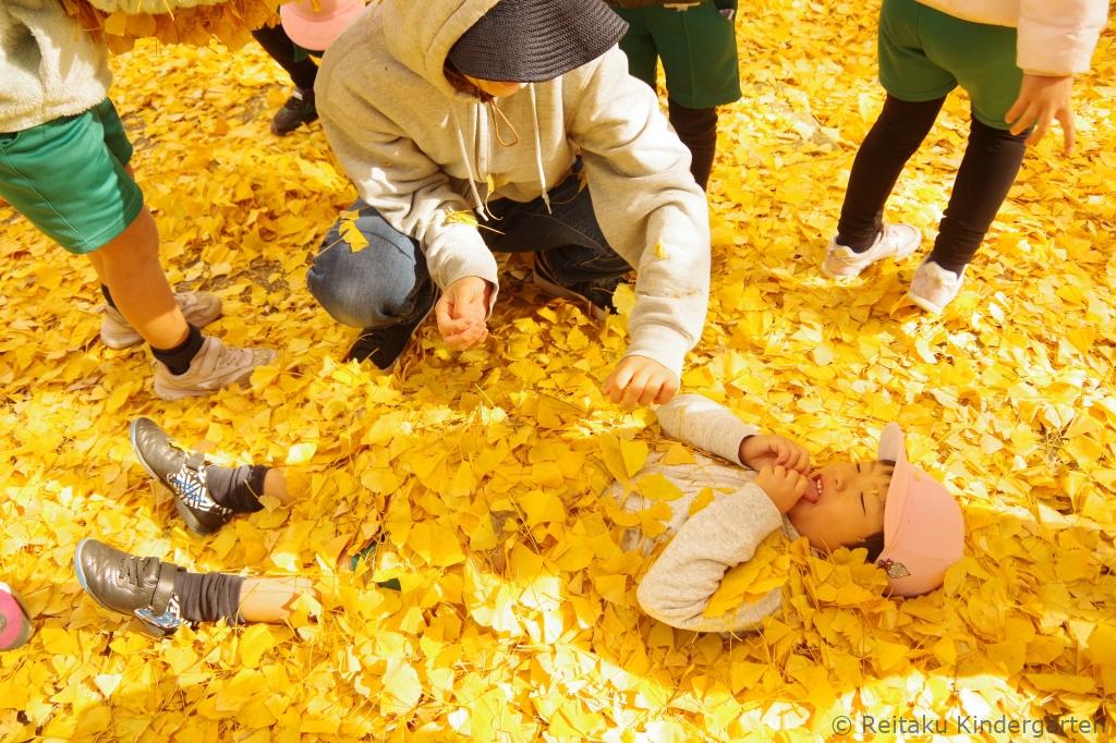 落葉や木の実を集めながら、「とっても綺麗!」、「黄色の絨毯みたい!」、「どうして、葉っぱの色が赤くなるのかな?」などと楽しむ子どもたち。秋の自然を体中で感じることができたようです。