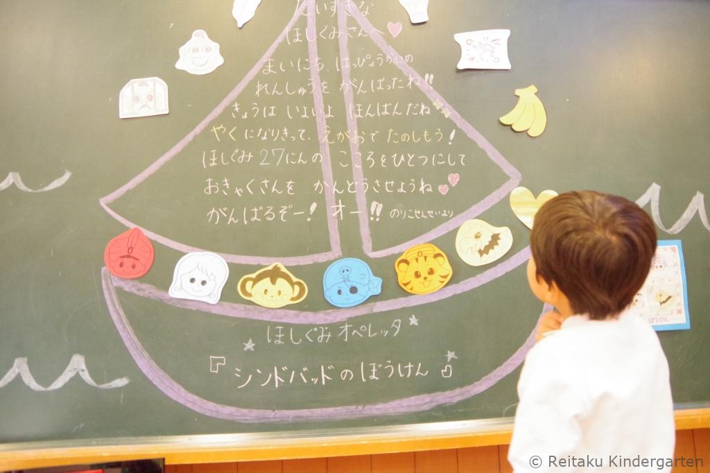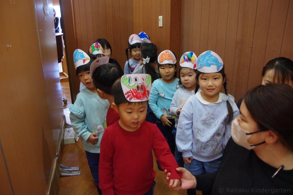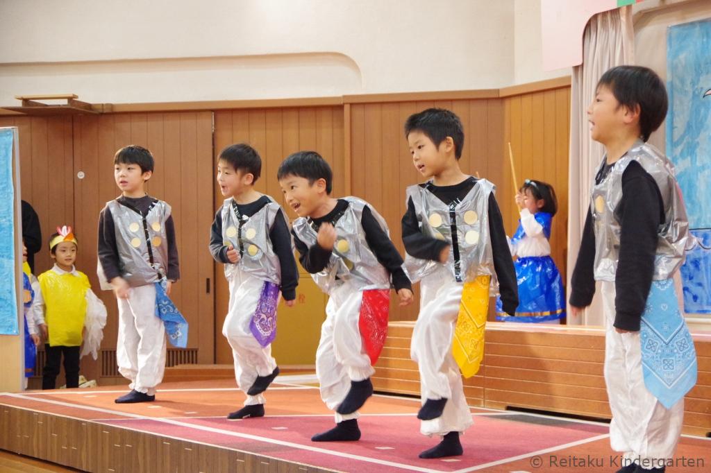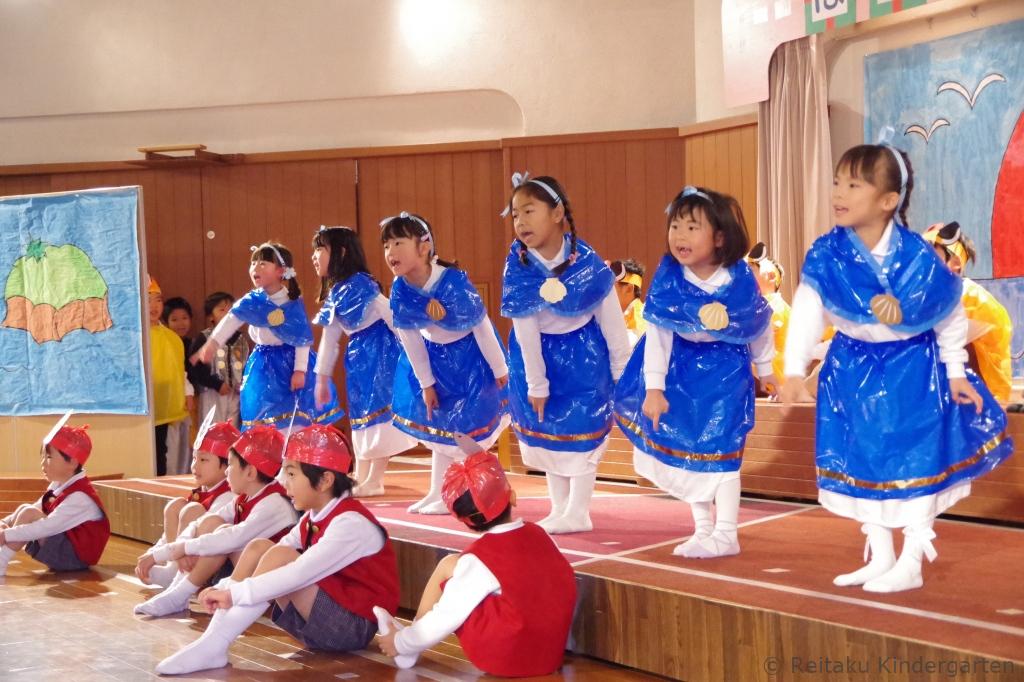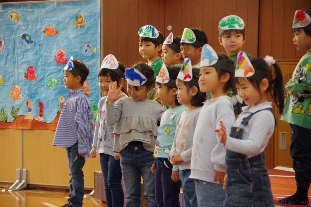 りす組は「うみのたからもの」の表現遊びを、すみれ組は「ありがとうにありがとう」の劇遊びを、ほし組は、「シンドバッドの冒険」のオペレッタをそれぞれ発表しました。
