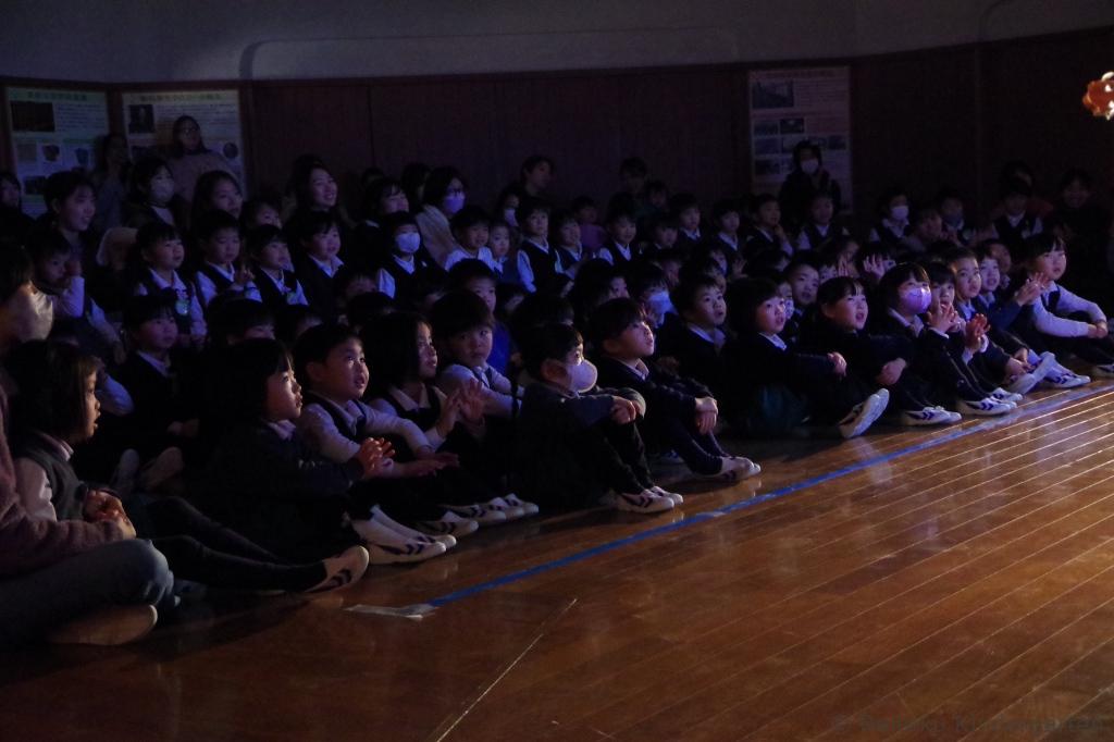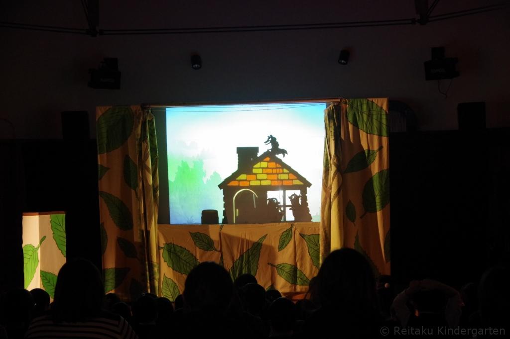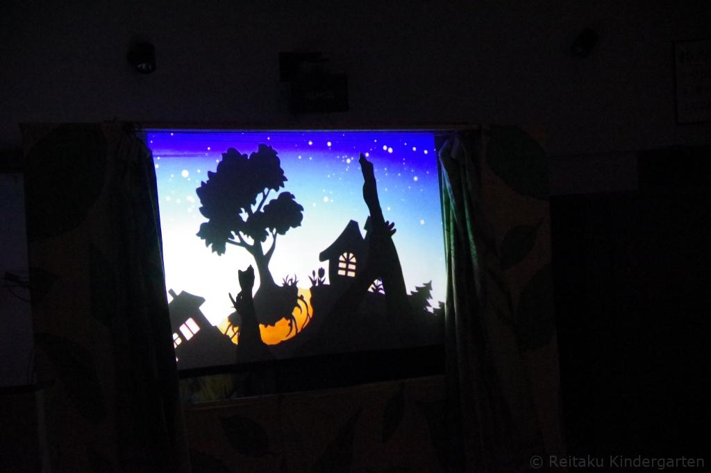 いよいよ影絵の始まりです。遊戯室が暗くなり、照明だけの明るさになりました。音楽とともに、ステージに鮮やかな影絵が浮かび上がりました。今まで見たこともない本格的な影絵の世界にみんな夢中になりました。