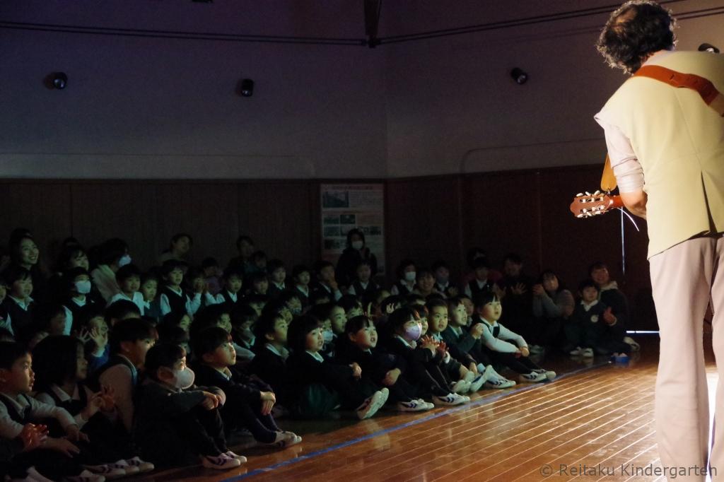 1月17日(木)、子どもたちに芸術に触れる機会を作るため、父母の会主催の下劇団かかし座による影絵「みなみのうみのおとぎばなし」の鑑賞会が遊戯室で行われました。