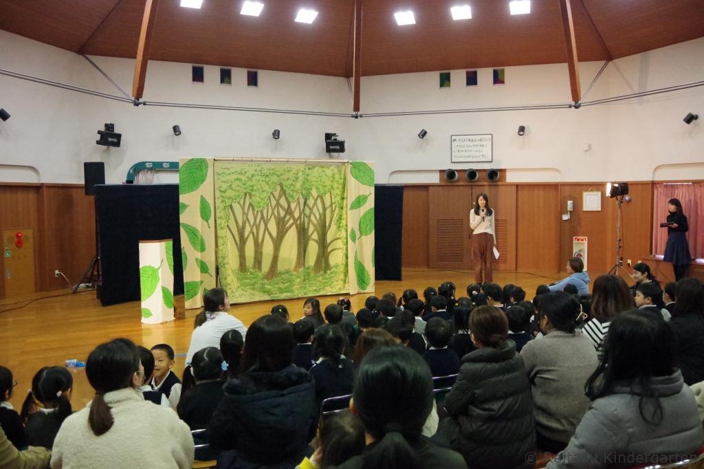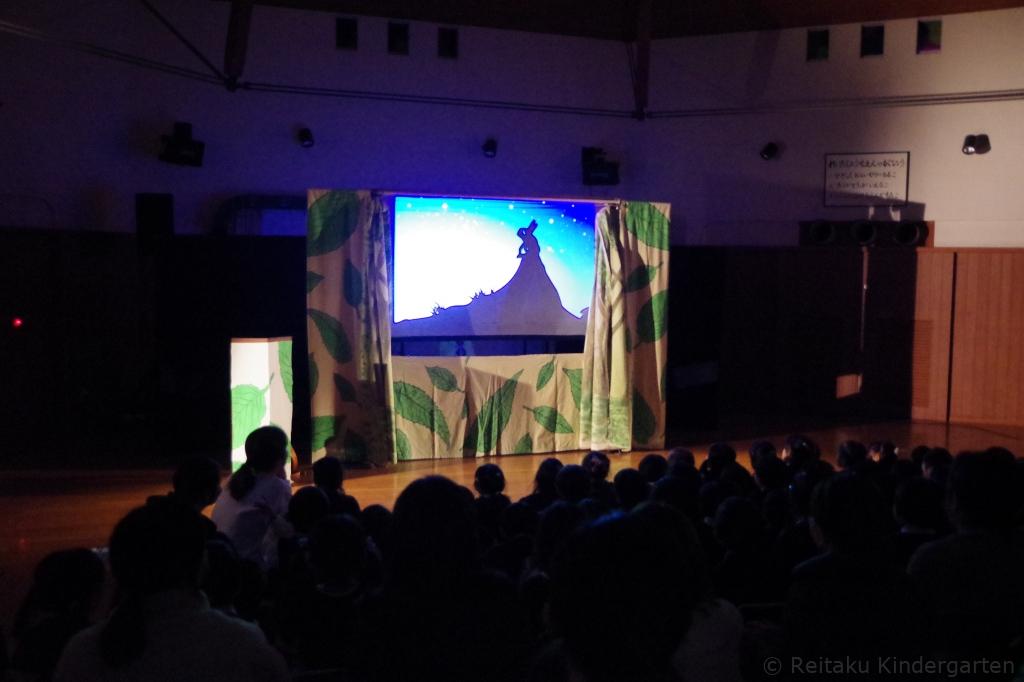 当日は、2部に分かれて、親子で素敵な影絵の世界を約50分楽しみました。園児たちが登園してくると、遊戯室にはいろんな飾り付けと照明器具が取り付けられていて、遊戯室はまるで別世界に変わっていました。これからどんなすばらしいことが遊戯室で行われるのだろうかとみんな胸をワクワクさせています。