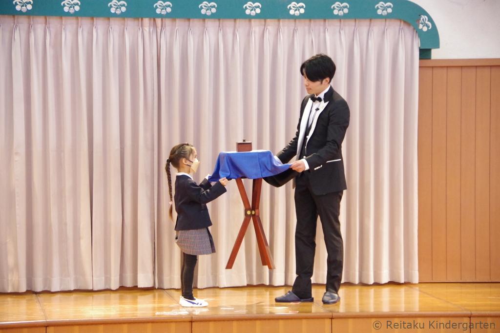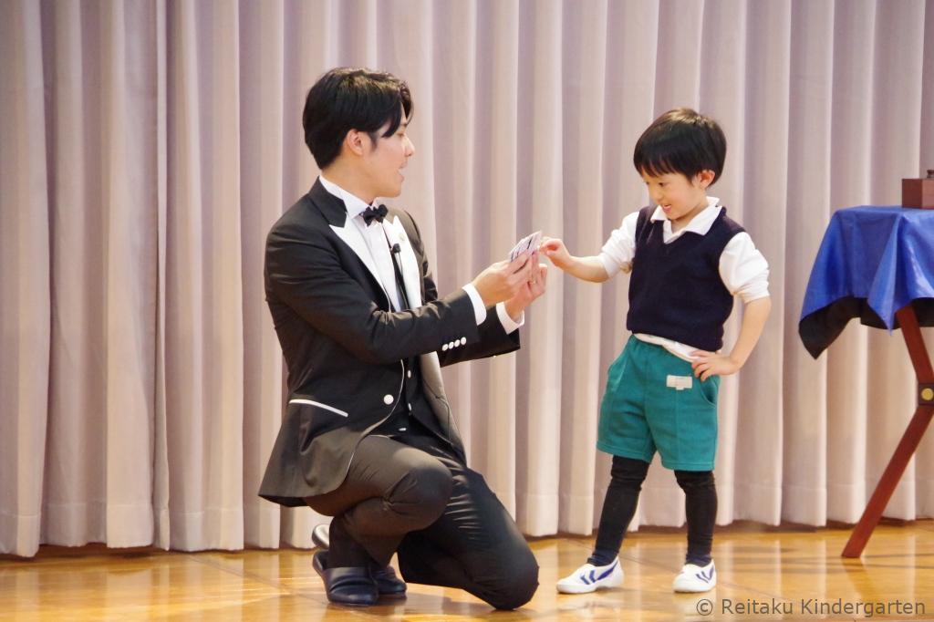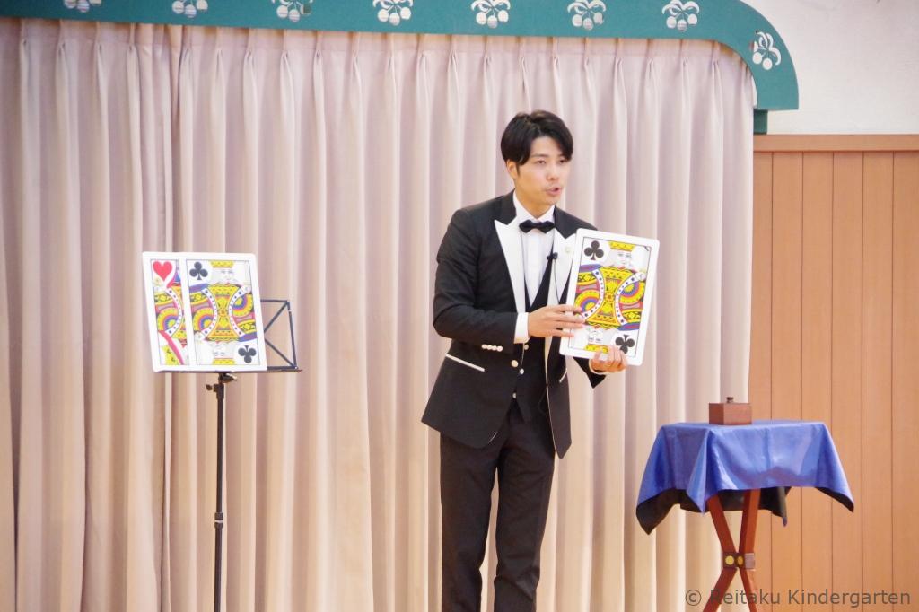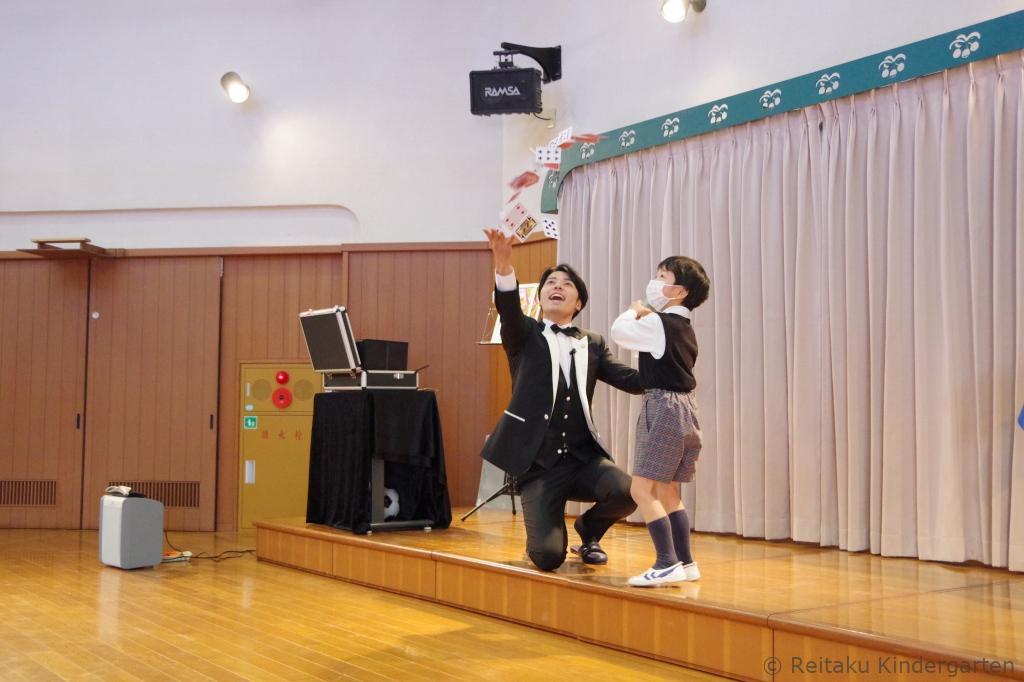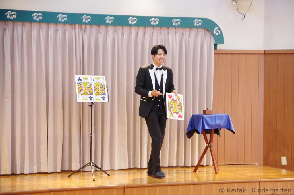マジックショーを披露してくださったのは、系列校である麗澤瑞浪高校の卒業生鵜飼太士(うかいたいし)さん。