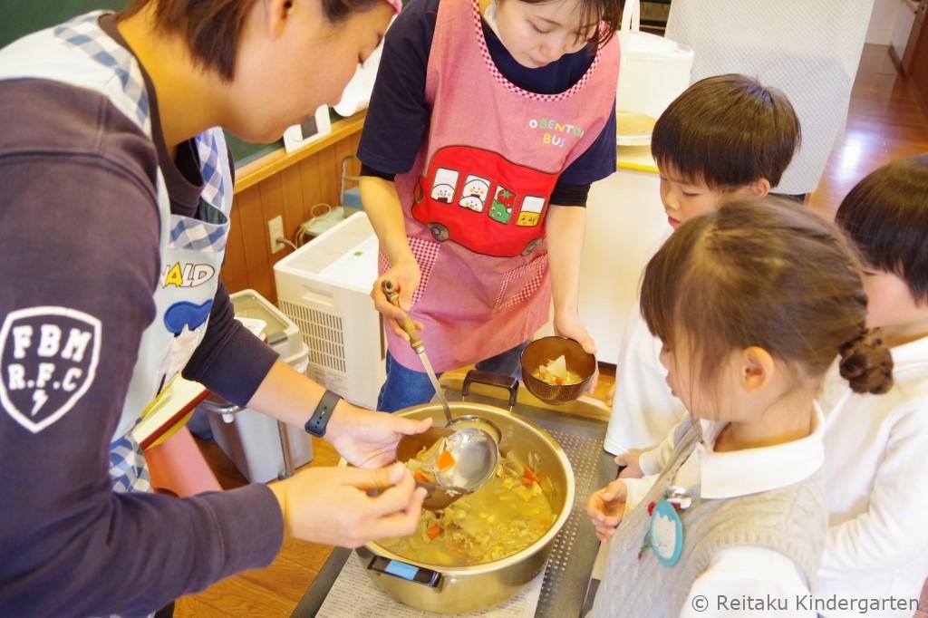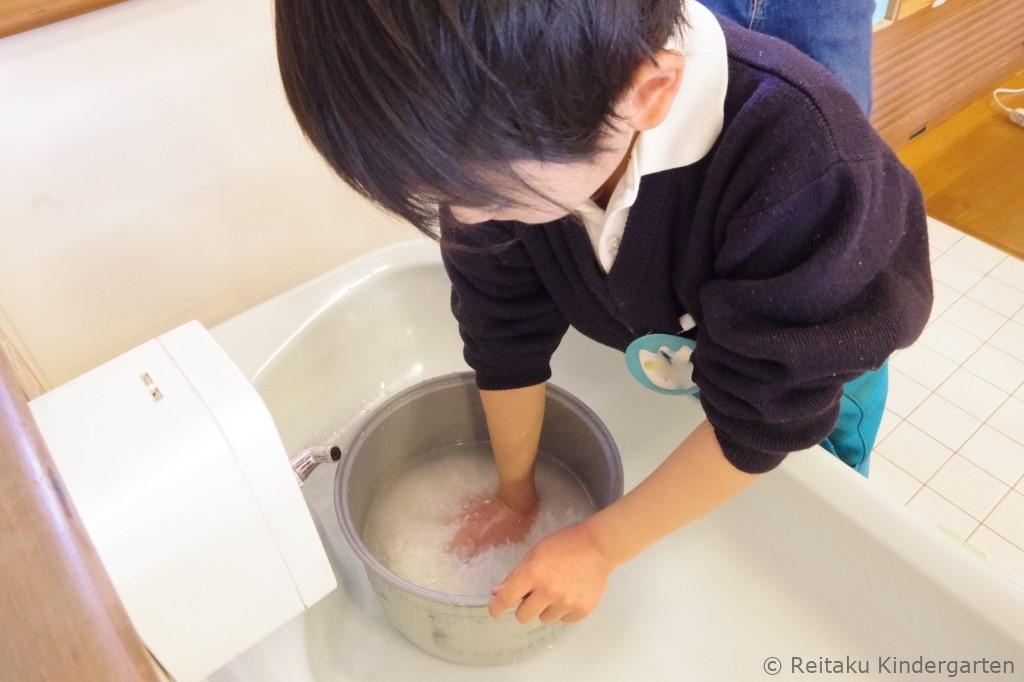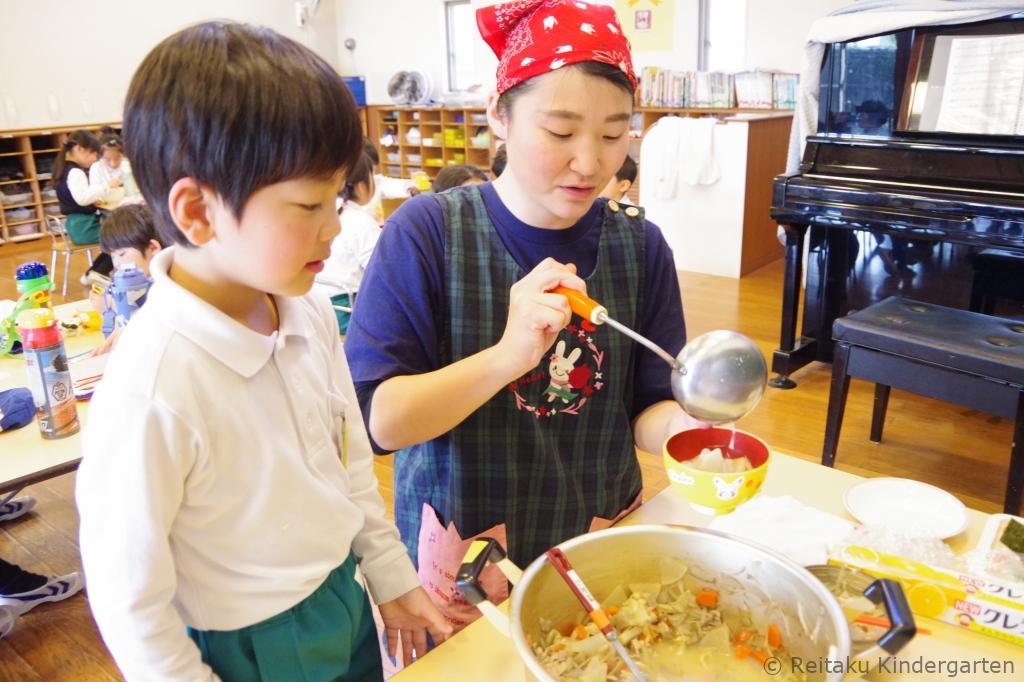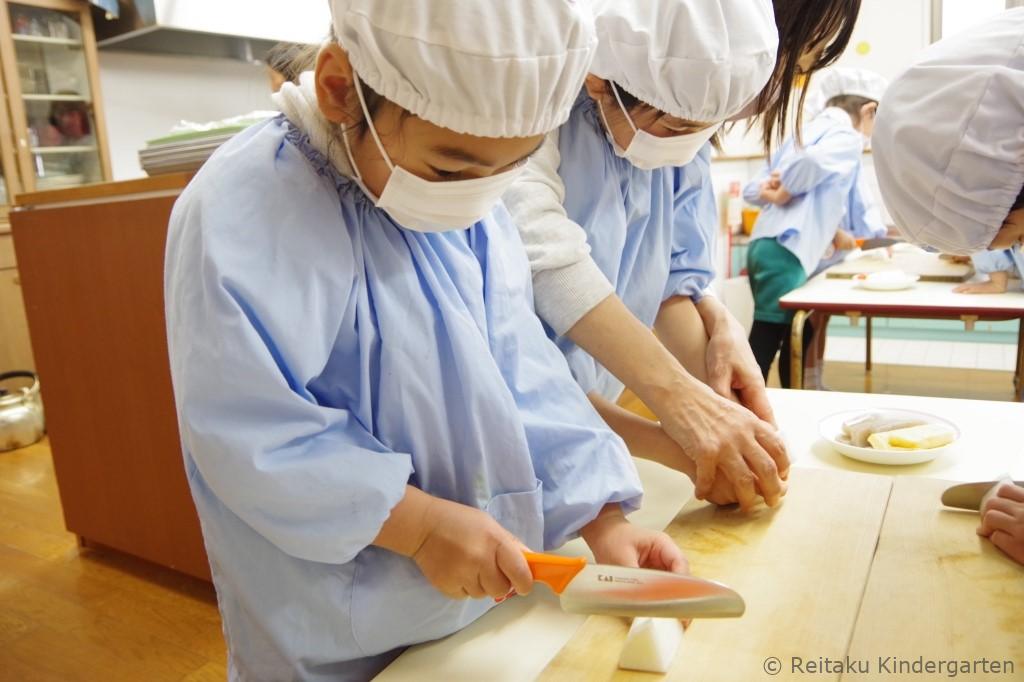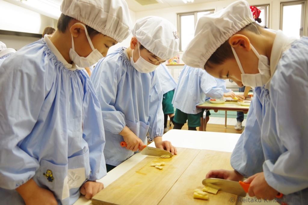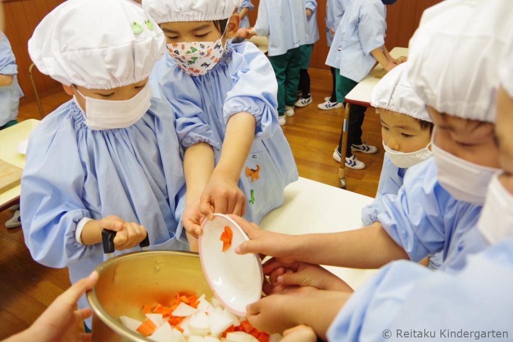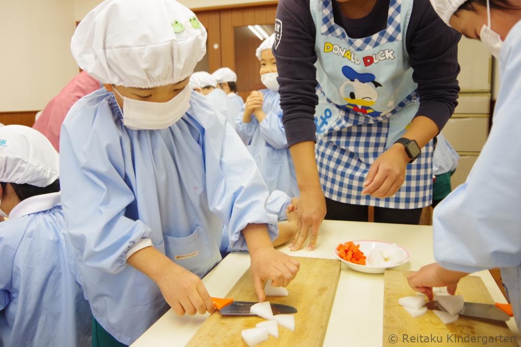 クラスでお米を研ぎ、炊飯器をつけた後は、台所で豚汁の具材(ニンジン、ダイコン、油揚げ)を食べやすい大きさに切っていきます。あっという間に豚汁の下準備ができました。あとは、事務室の先生に味付けをお願いして、保育室に戻ります。