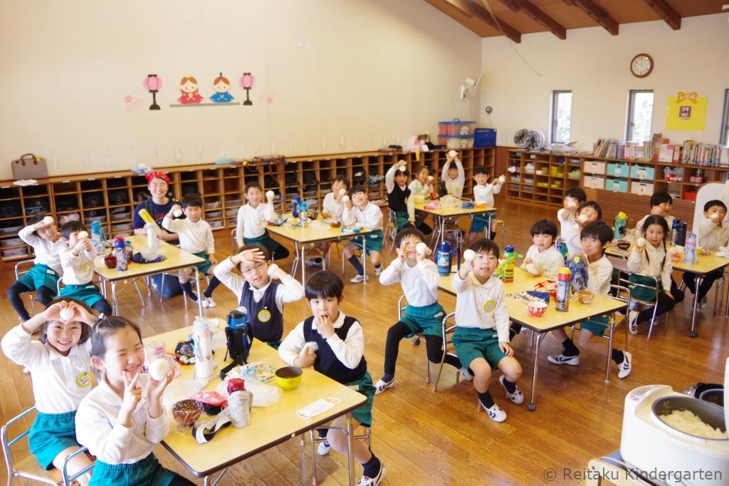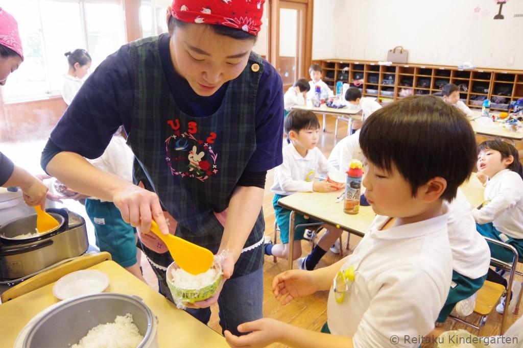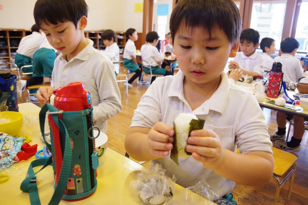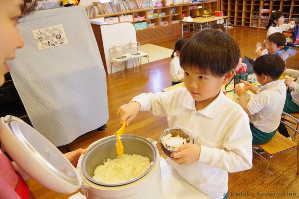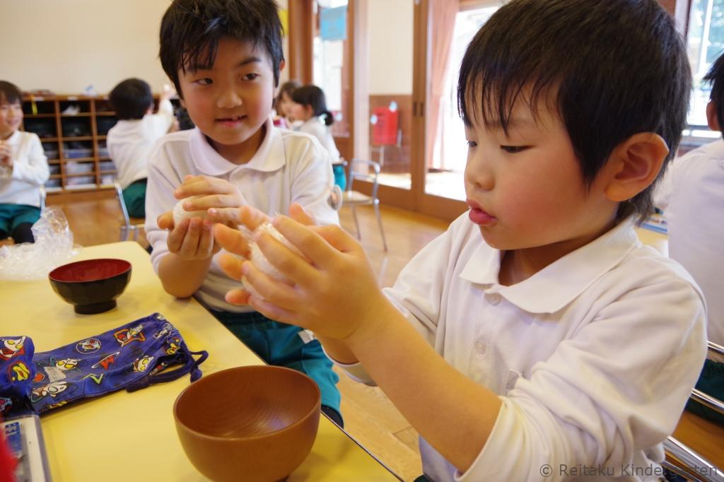 ご飯が炊けたら、いよいよおにぎり作りに挑戦です。普段は、お母さんが愛情をたっぷり詰めて作ってくれているおにぎり。お母さんのことを思いながら、どの子も心をこめてにぎっていました。