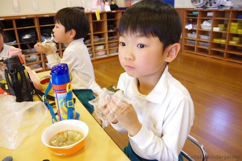 自分たちで作った豚汁とおにぎりはとてもおいしかったようです。いつもお料理をしてくれるお母さんへのありがとうの気持ちを改めて持つことが出来、素敵なお料理の時間となりました。お家でも、家族のみんなに作ってあげてね!