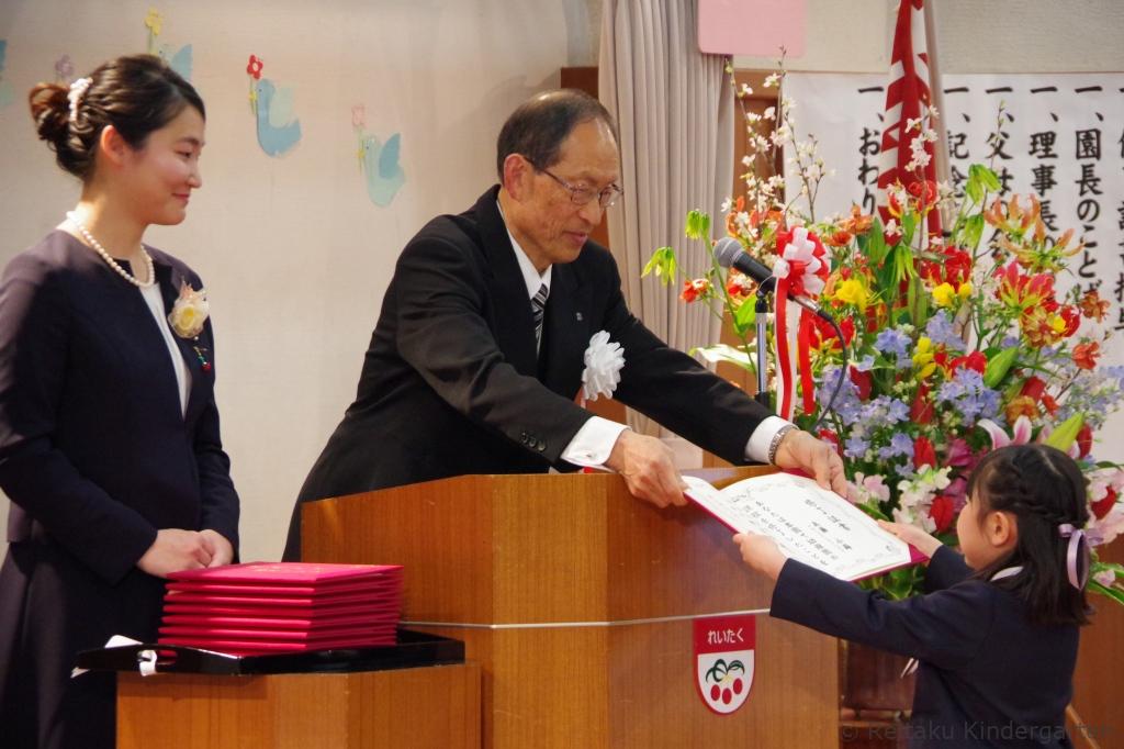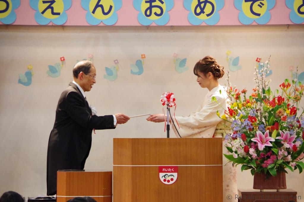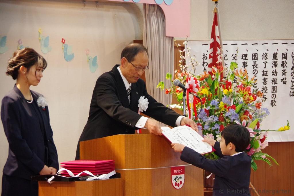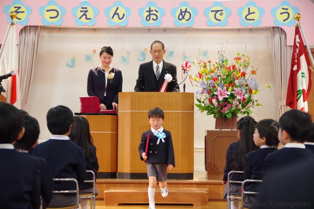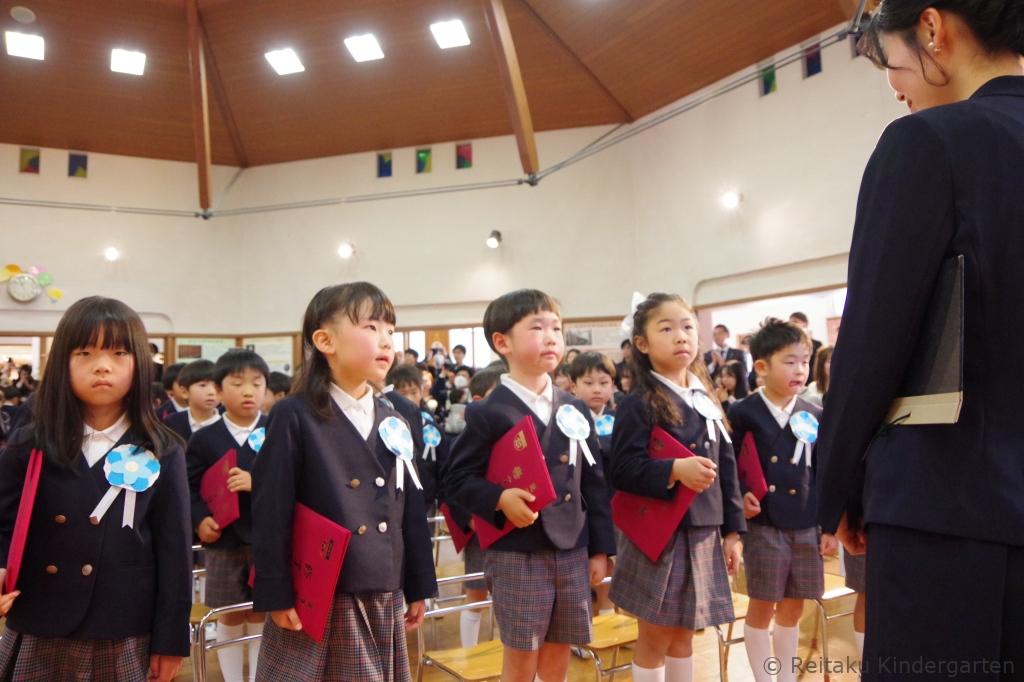 卒園式では、ご来賓の皆様や保護者の皆様からの拍手の中、卒園児たちが堂々と胸を張って遊戯室に入場してきました。担任の先生より名前を呼ばれると、一人ひとり元気な声で返事をして園長先生から修了証書をいただきます。