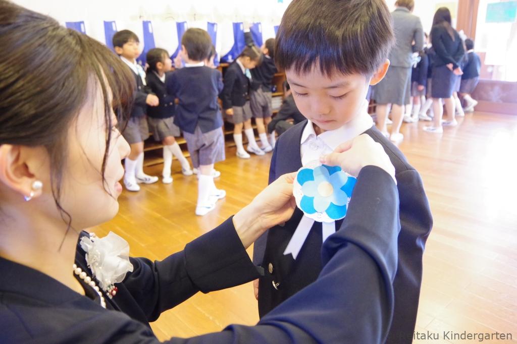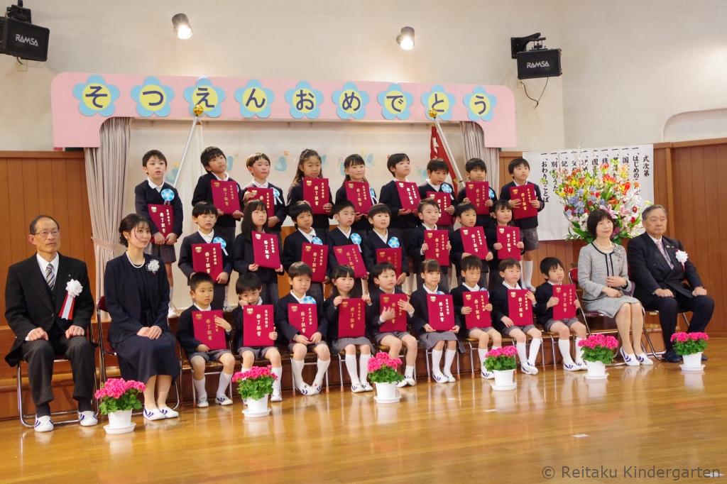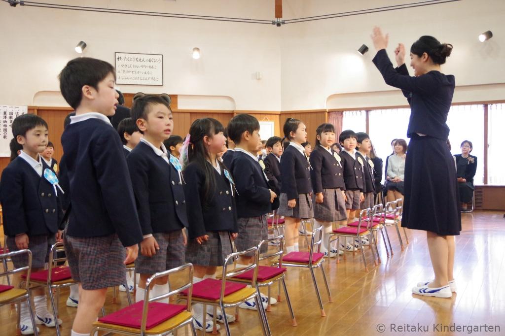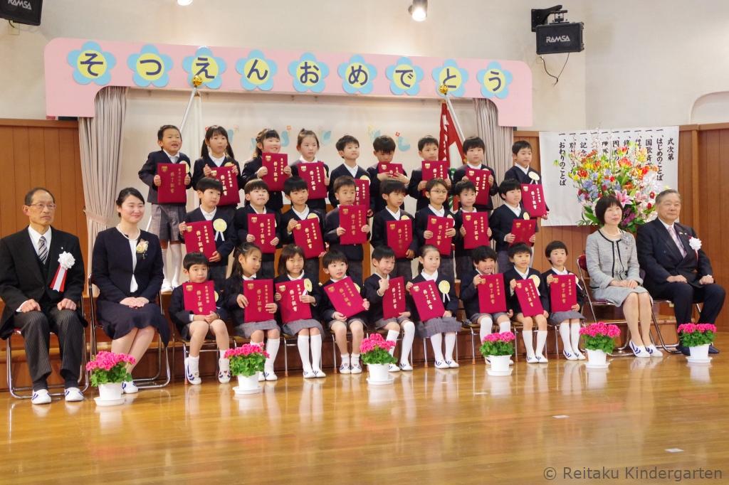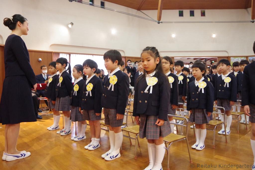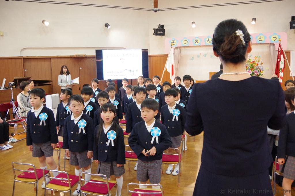 卒園式では、ご来賓の皆様や保護者の皆様からの拍手の中、卒園児たちが堂々と胸を張って遊戯室に入場してきました。担任の先生より名前を呼ばれると、一人ひとり元気な声で返事をして園長先生から修了証書をいただきます。