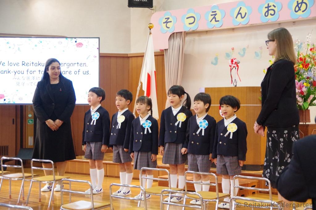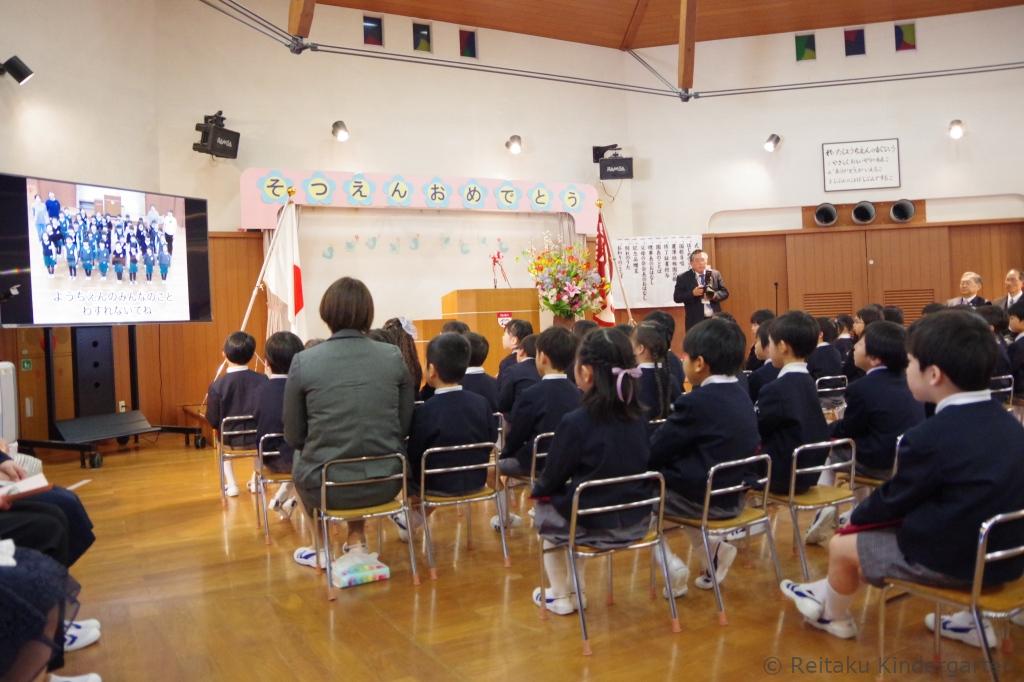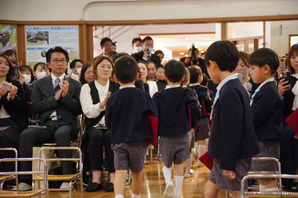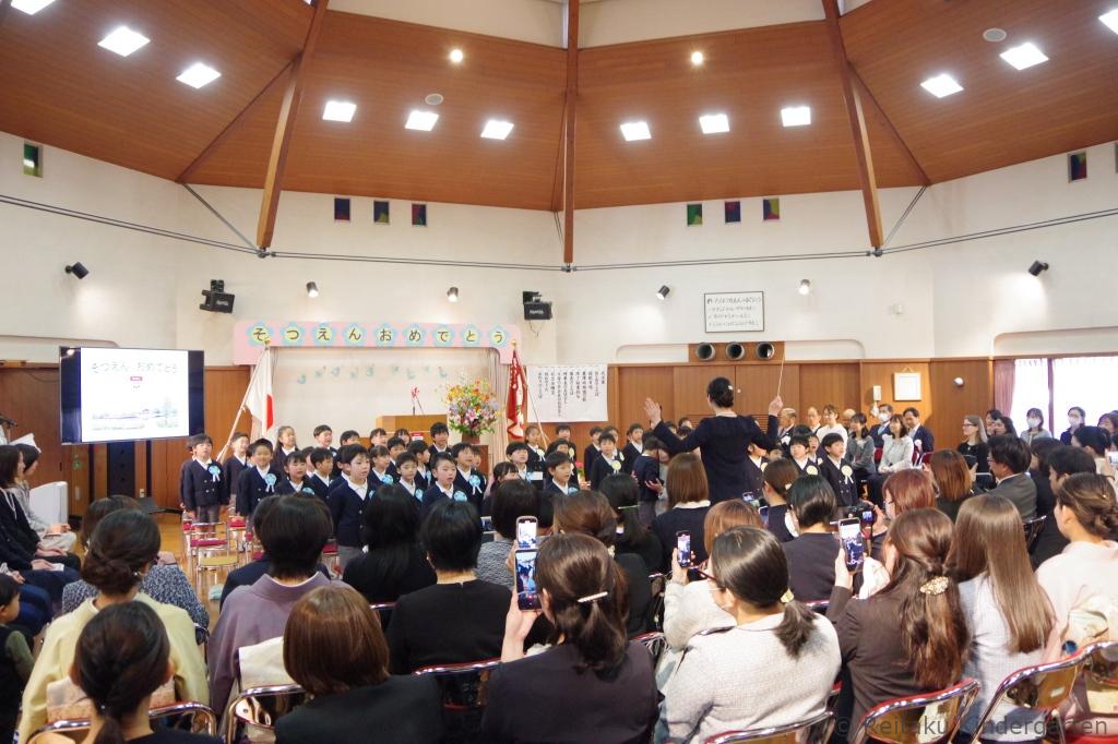 会場のモニターには卒園児の入園直前の幼い顔と現在の顔が一人ひとり映しだされました。1年~3年の間に立派に、たくましく成長した子どもたちの姿に参列した保護者の方も感無量のようで、会場は喜びや感謝の温かい雰囲気に包まれました。