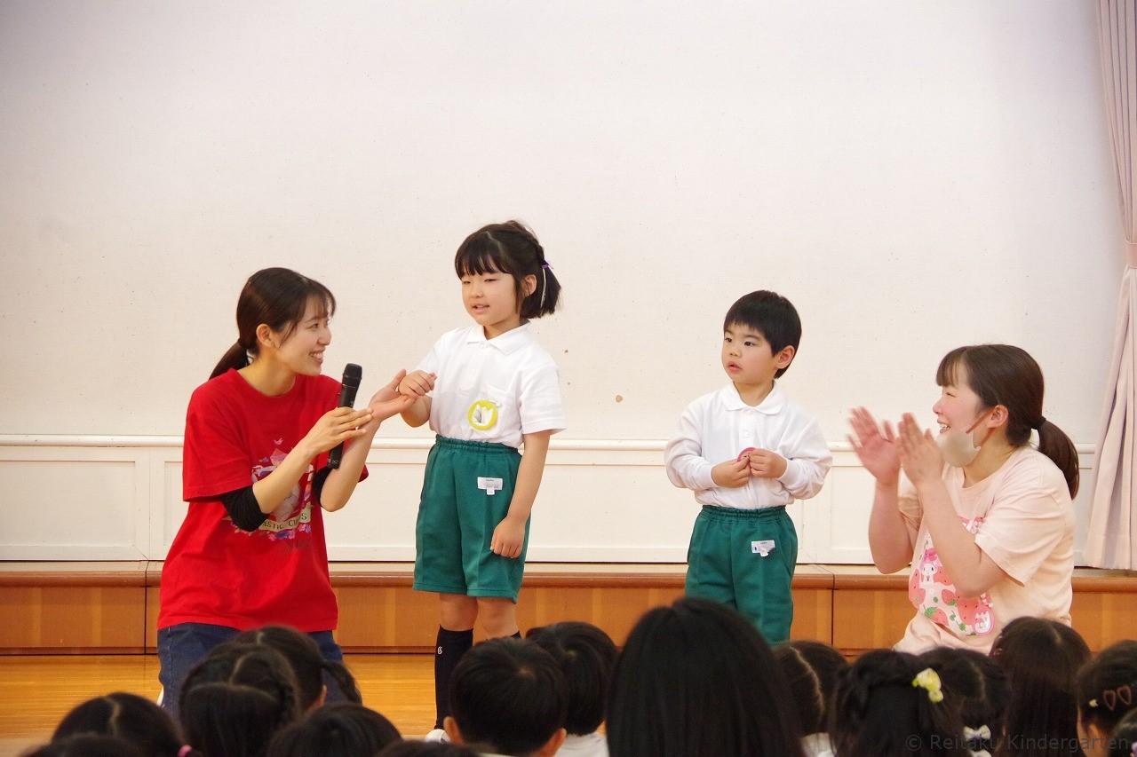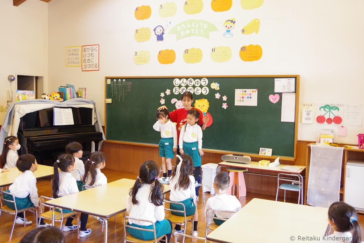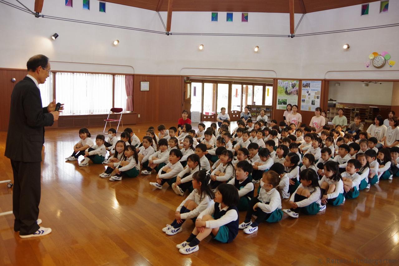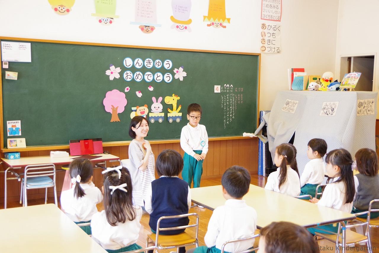 始業式が遊戯室にて行われました。園長先生よりお話がありました。 「新年度になり、進級してクラスもお友だちも先生も代わりました。みんな仲良く楽しく遊んでください。色々なことがあったときに、自分の頭でどうしてかな?と考えることはとっても大切です。今まで卒園したお兄さんお姉さんにしてもらった恩を返す代わりに、新しく入ってきた年少組に恩送りができるお友だちになってください。」等のお話がありました。みんな園長先生の話を熱心に聞いていました。その後、今年度から新たに幼稚園に仲間入りしたお友だちと、新たに着任された先生の紹介がありました。