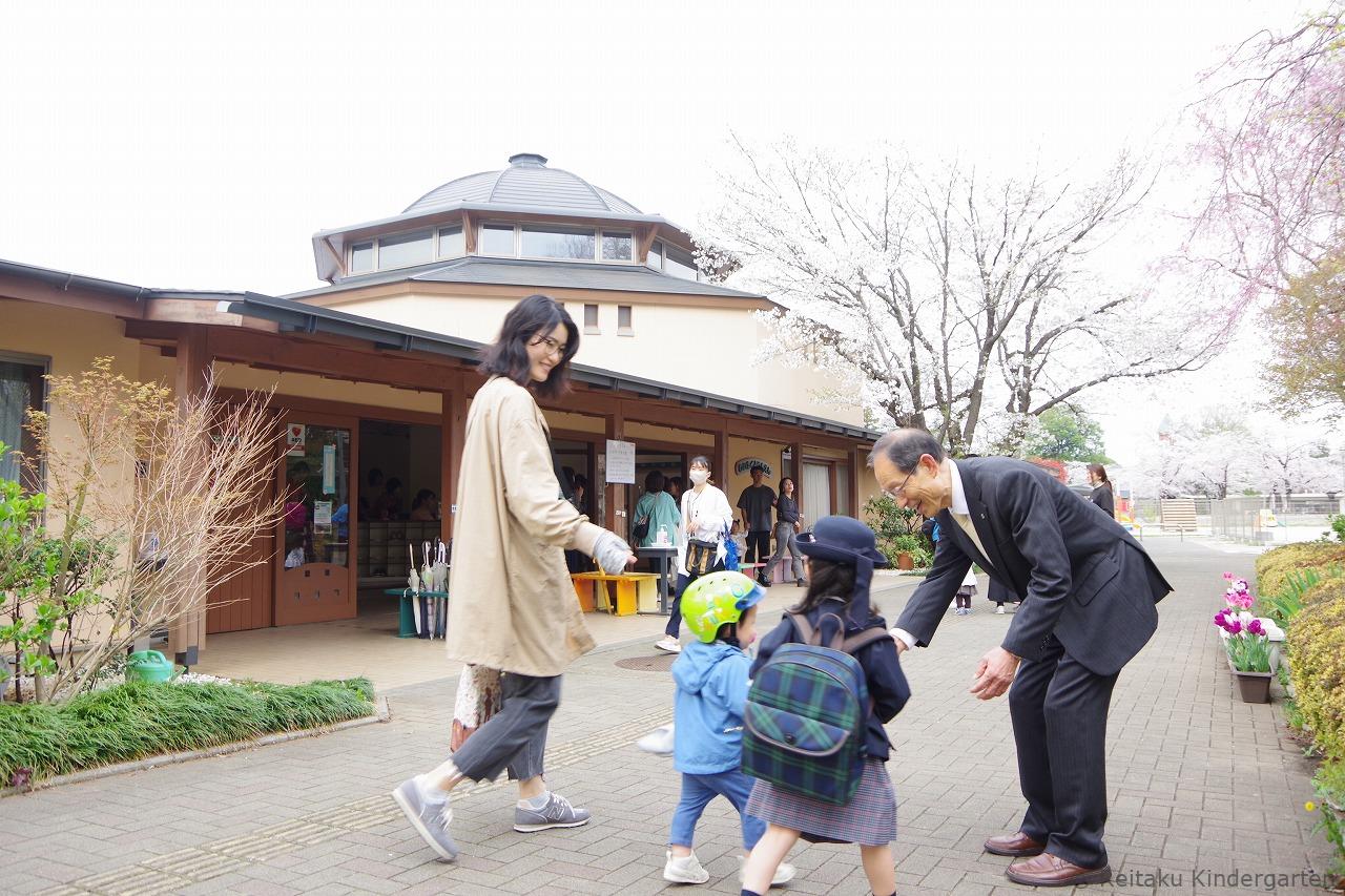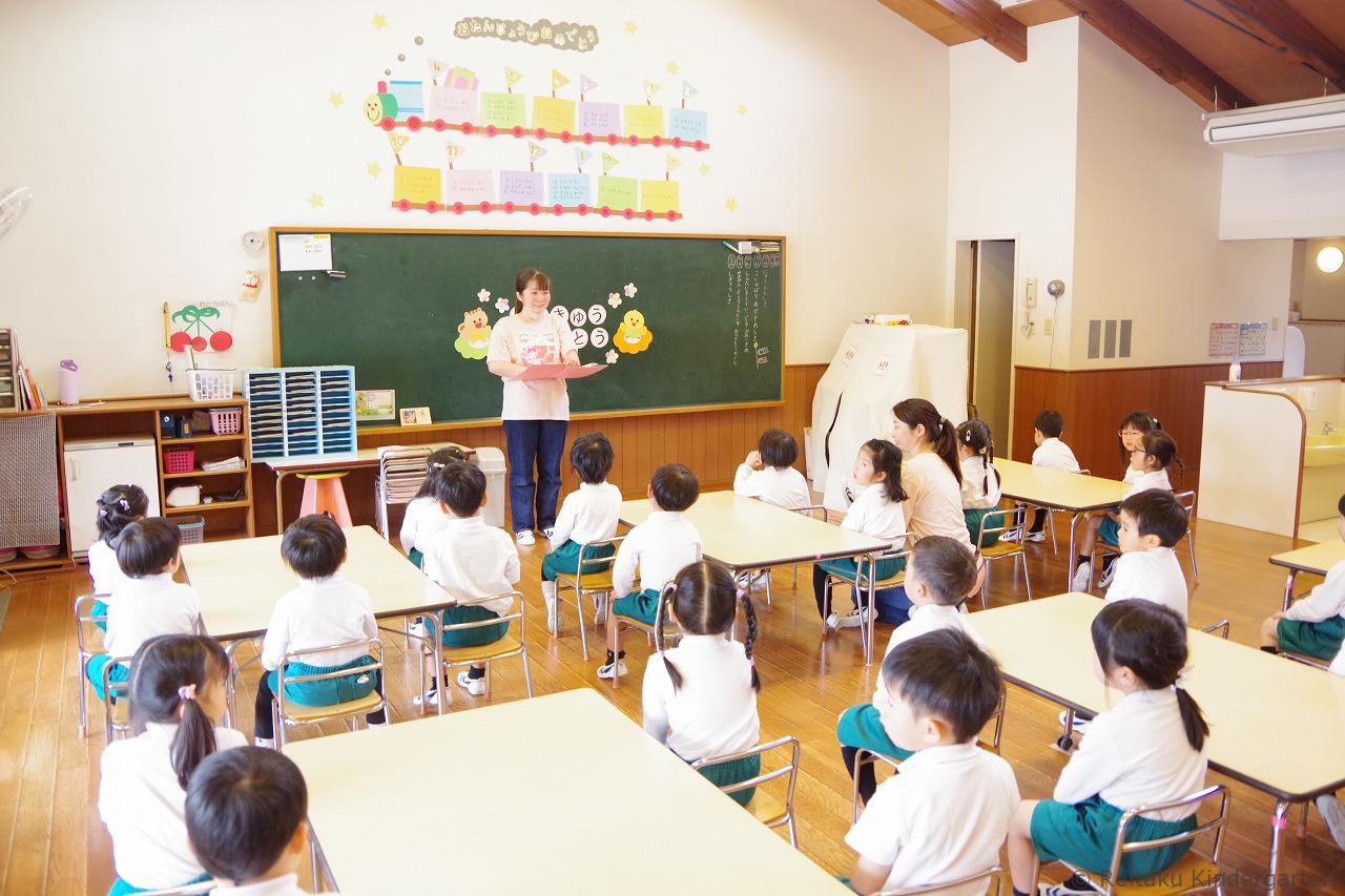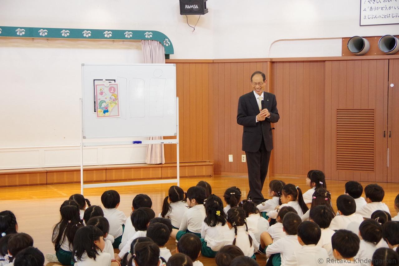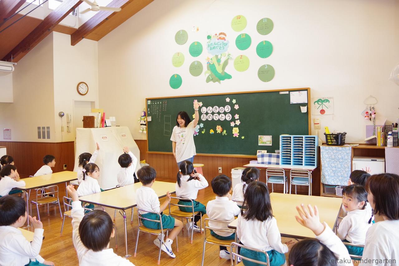 始業式が遊戯室にて行われました。園長先生よりお話がありました。 「新年度になり、進級してクラスもお友だちも先生も代わりました。みんな仲良く楽しく遊んでください。色々なことがあったときに、自分の頭でどうしてかな?と考えることはとっても大切です。今まで卒園したお兄さんお姉さんにしてもらった恩を返す代わりに、新しく入ってきた年少組に恩送りができるお友だちになってください。」等のお話がありました。みんな園長先生の話を熱心に聞いていました。その後、今年度から新たに幼稚園に仲間入りしたお友だちと、新たに着任された先生の紹介がありました。