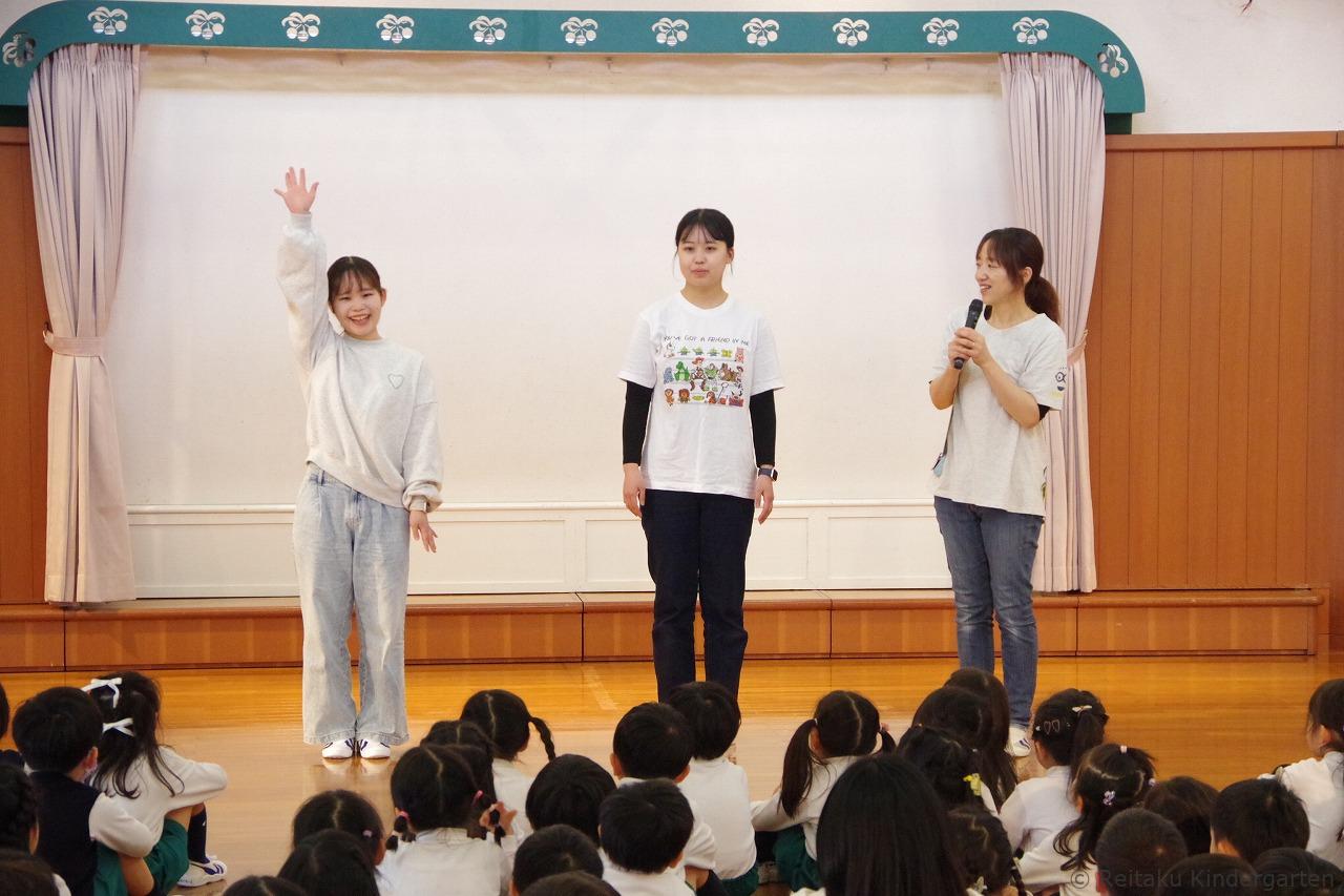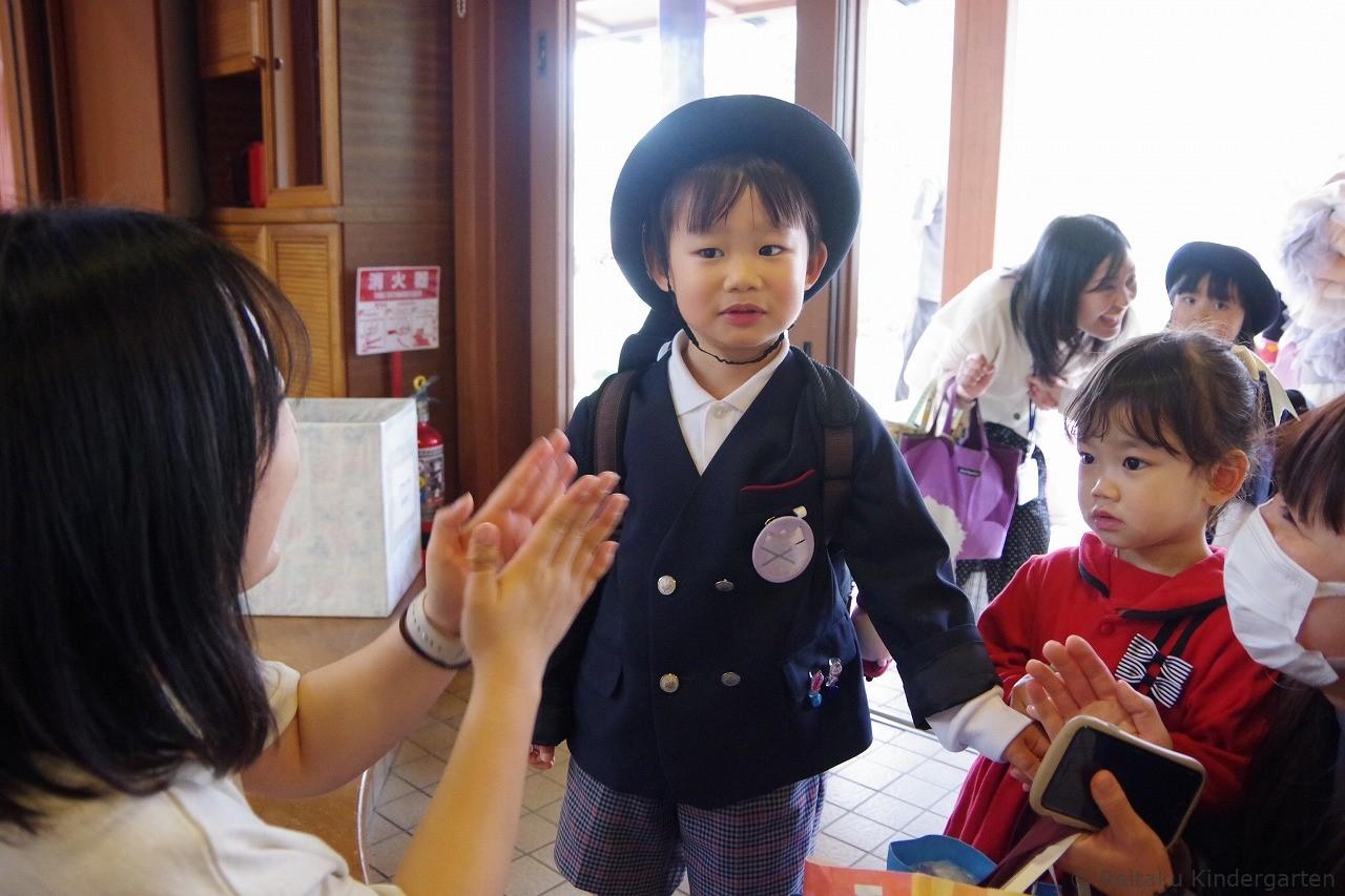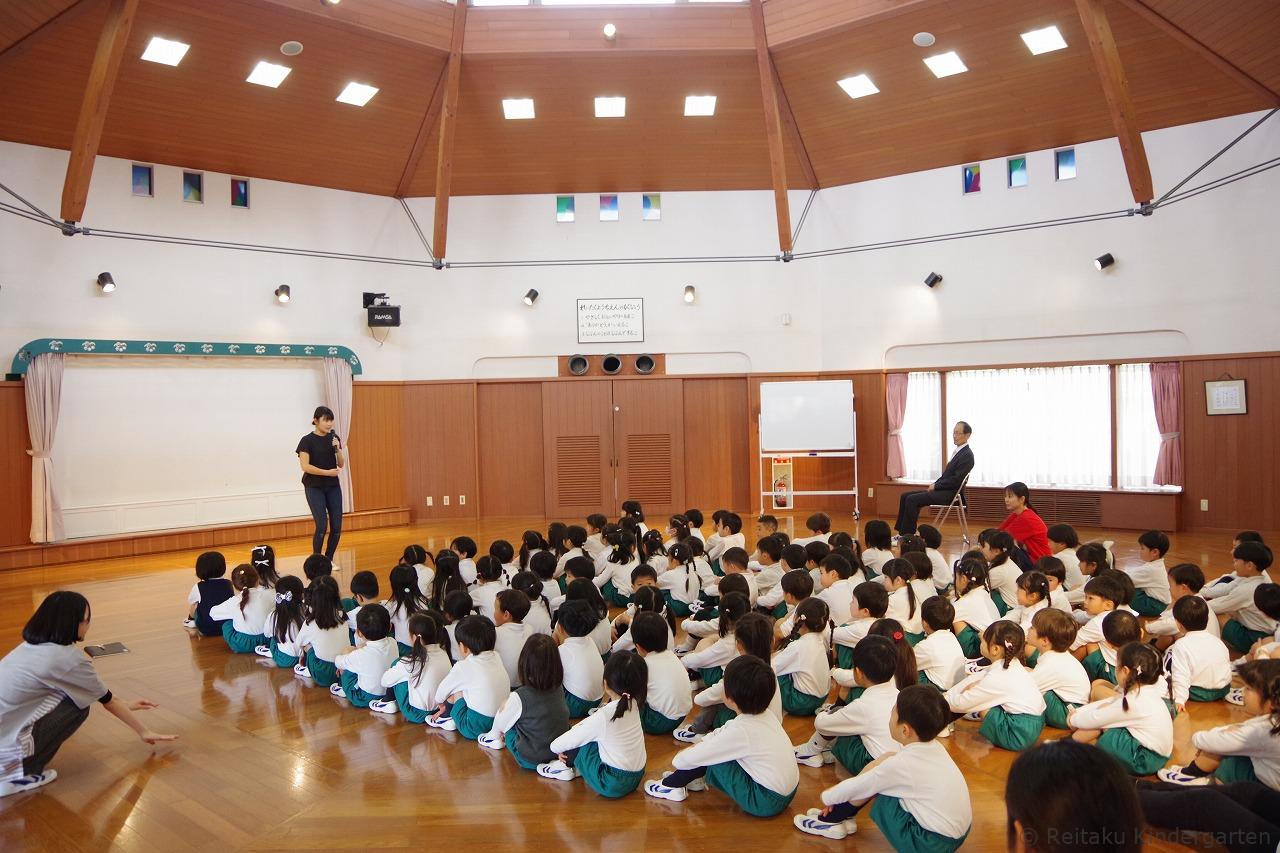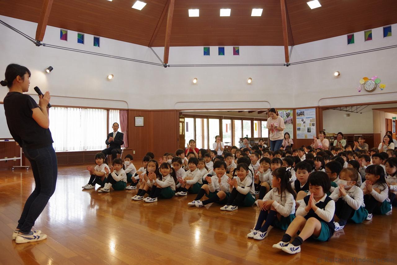 始業式が遊戯室にて行われました。園長先生よりお話がありました。 「新年度になり、進級してクラスもお友だちも先生も代わりました。みんな仲良く楽しく遊んでください。色々なことがあったときに、自分の頭でどうしてかな?と考えることはとっても大切です。今まで卒園したお兄さんお姉さんにしてもらった恩を返す代わりに、新しく入ってきた年少組に恩送りができるお友だちになってください。」等のお話がありました。みんな園長先生の話を熱心に聞いていました。その後、今年度から新たに幼稚園に仲間入りしたお友だちと、新たに着任された先生の紹介がありました。