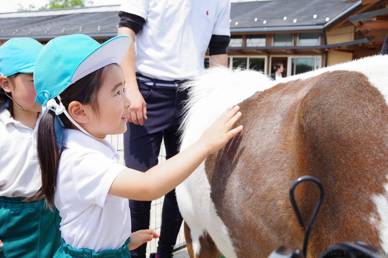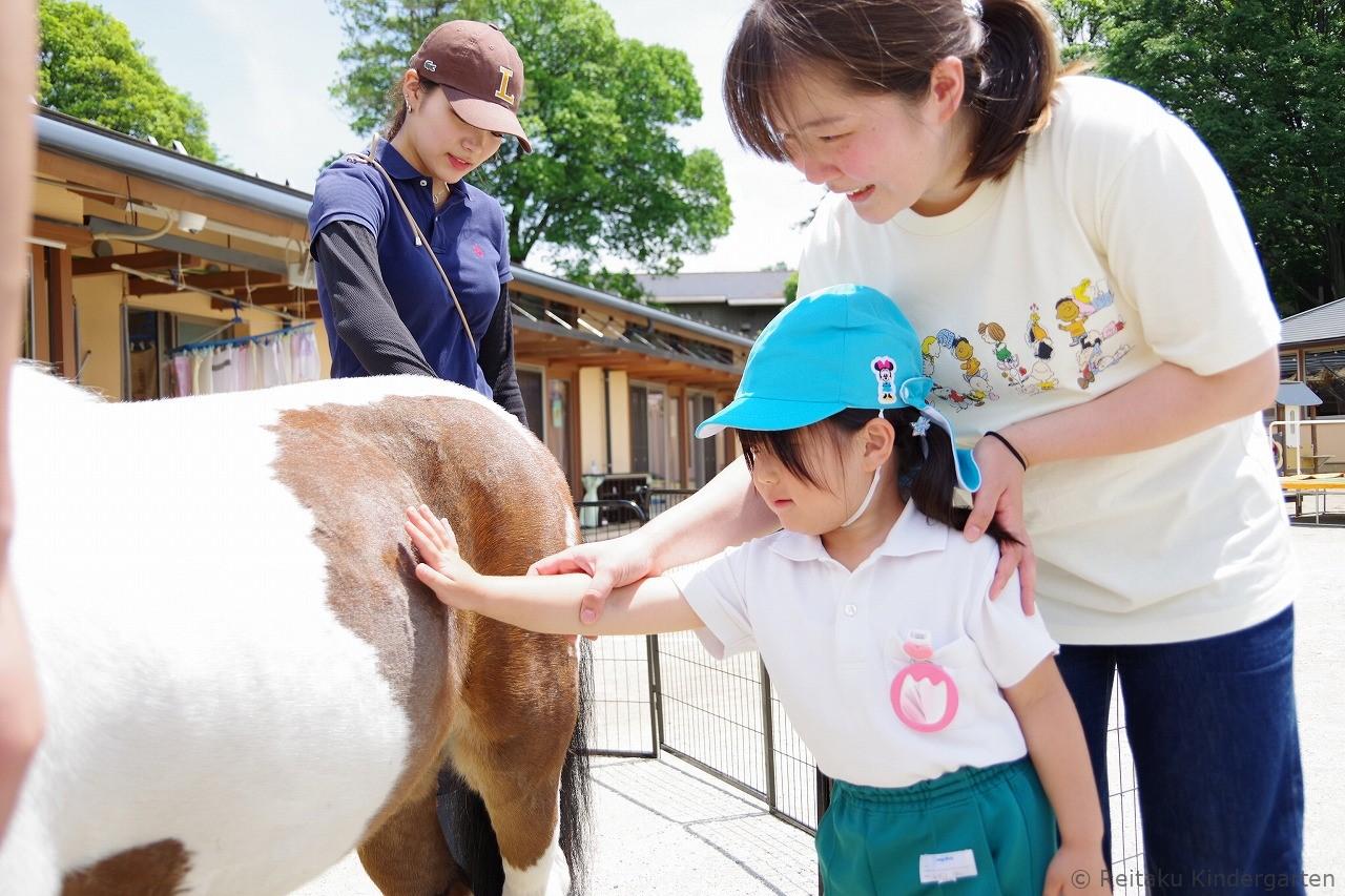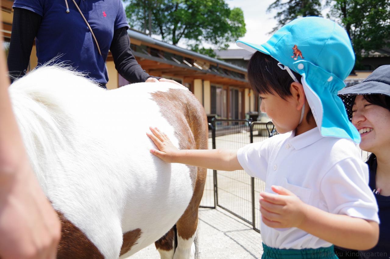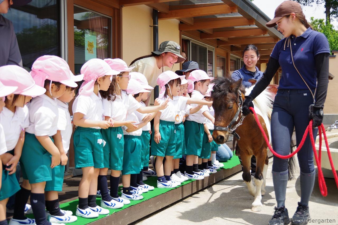5月21日(火)幼稚園の子どもたちが、学園内で飼育しているポニーとのふれあい体験を実施しました。今回の体験は麗澤大学馬術部に協力いただき、馬場を併設する麗澤大学のキャンパスを生かし、幼稚園児にとって身近に触れることのできないポニーとの接触を通じて、生き物への愛情や思いやりを育む機会として今回のイベントを実施しました。