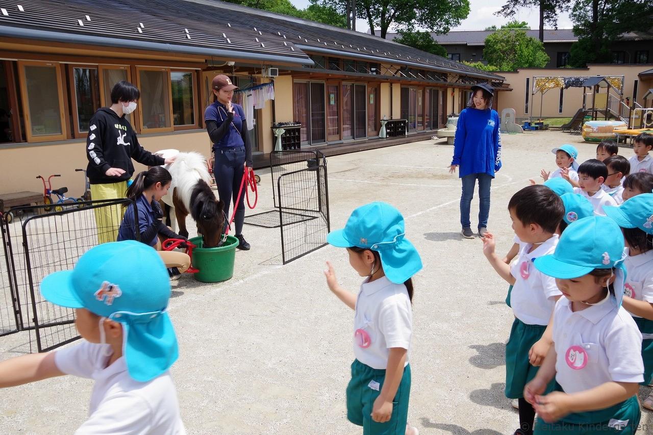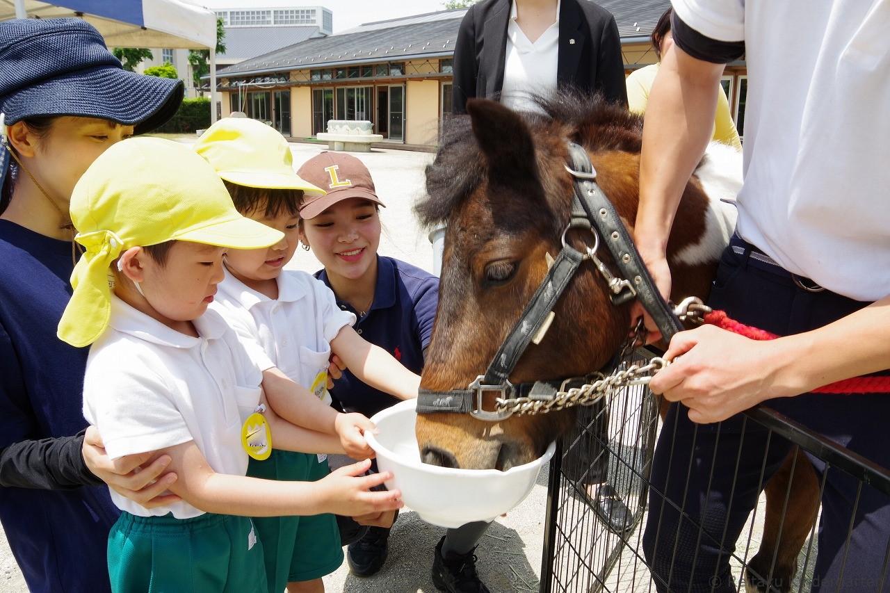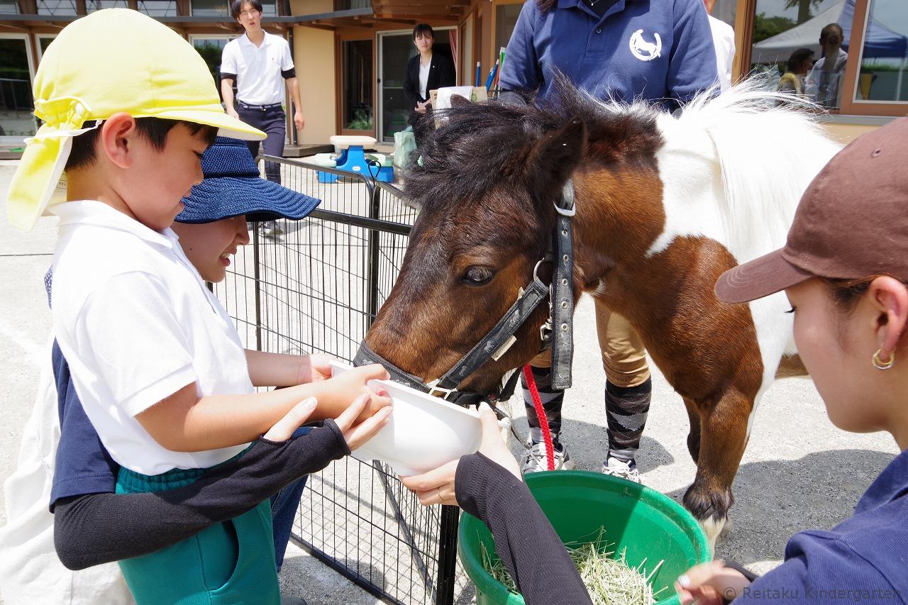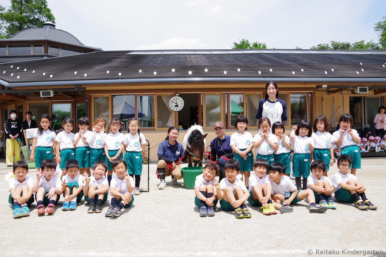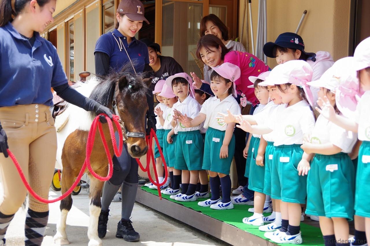 5月21日(火)幼稚園の子どもたちが、学園内で飼育しているポニーとのふれあい体験を実施しました。今回の体験は麗澤大学馬術部に協力いただき、馬場を併設する麗澤大学のキャンパスを生かし、幼稚園児にとって身近に触れることのできないポニーとの接触を通じて、生き物への愛情や思いやりを育む機会として今回のイベントを実施しました。