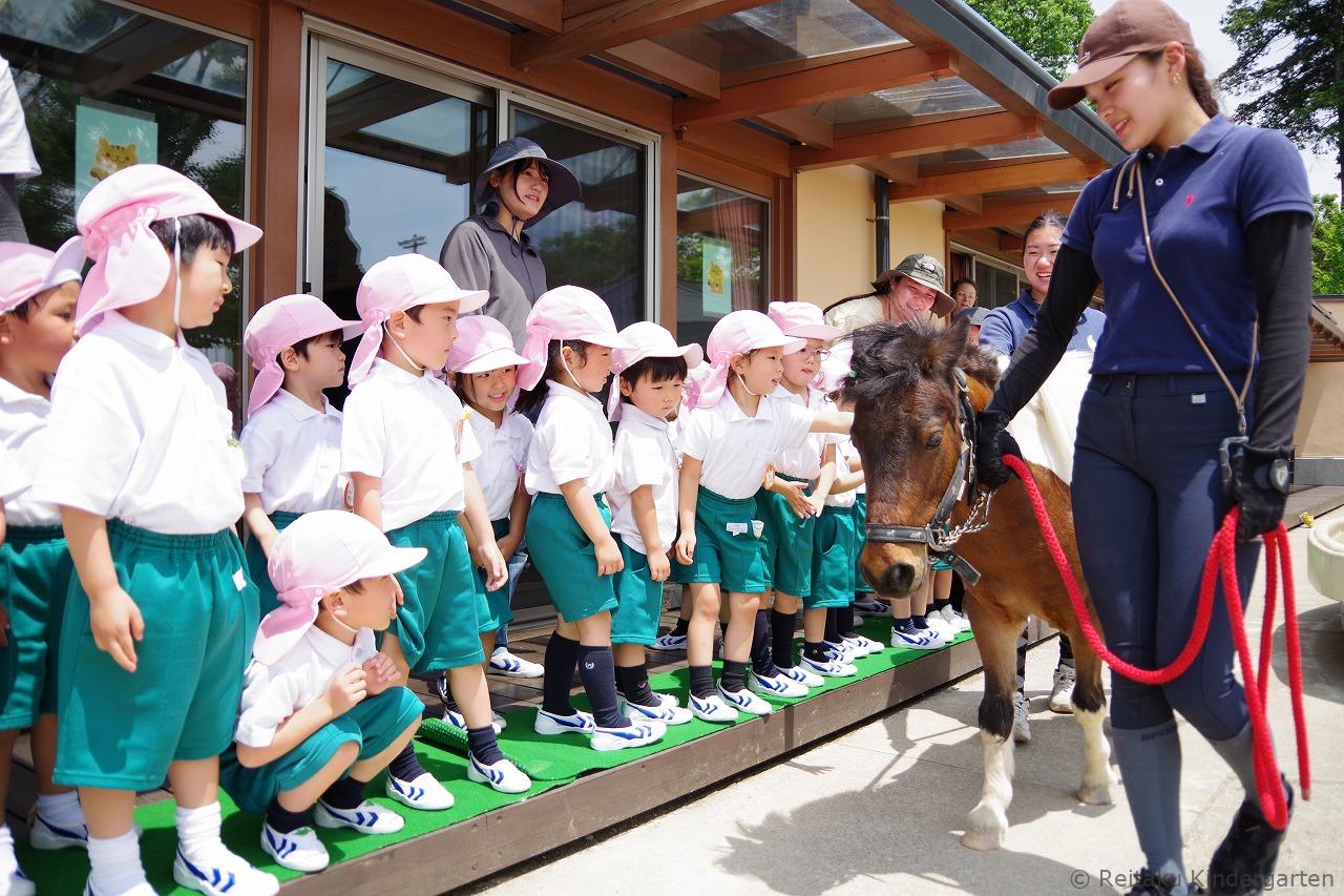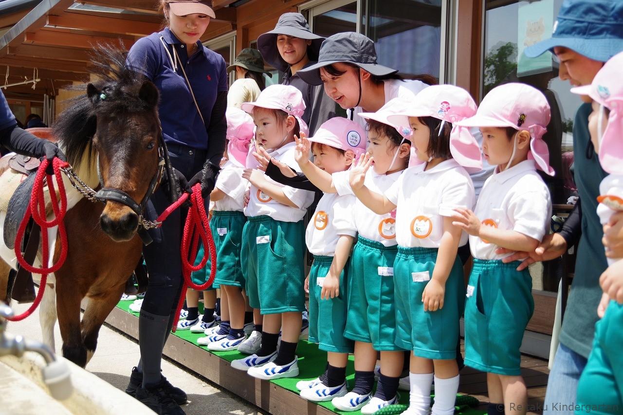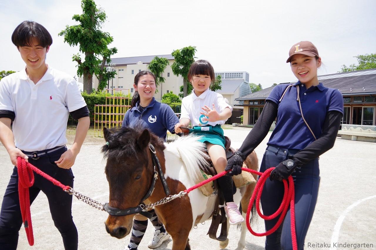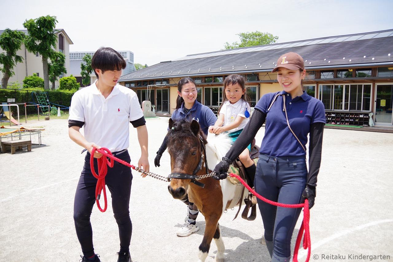 5月21日(火)幼稚園の子どもたちが、学園内で飼育しているポニーとのふれあい体験を実施しました。今回の体験は麗澤大学馬術部に協力いただき、馬場を併設する麗澤大学のキャンパスを生かし、幼稚園児にとって身近に触れることのできないポニーとの接触を通じて、生き物への愛情や思いやりを育む機会として今回のイベントを実施しました。