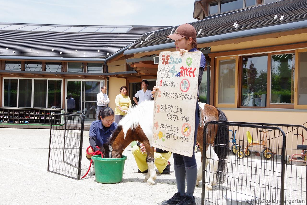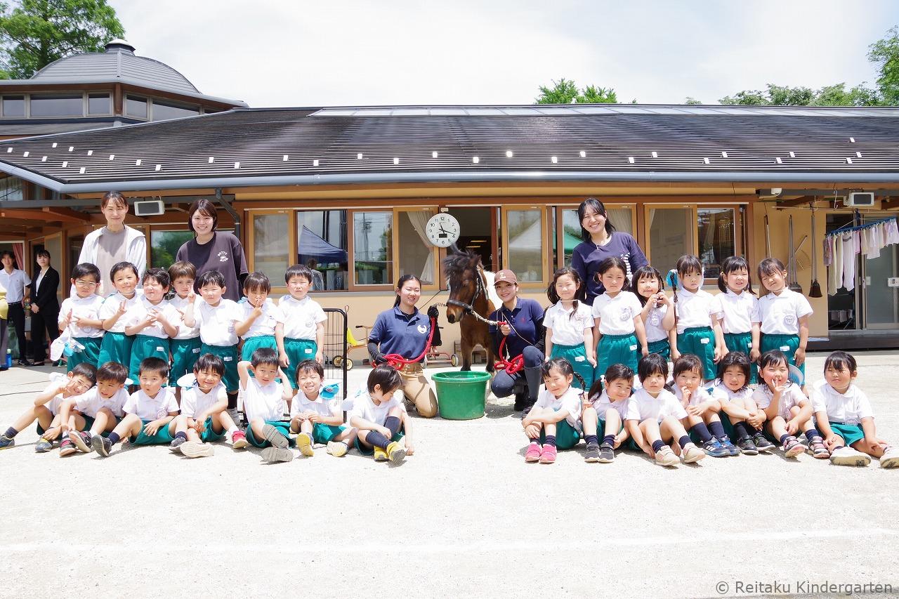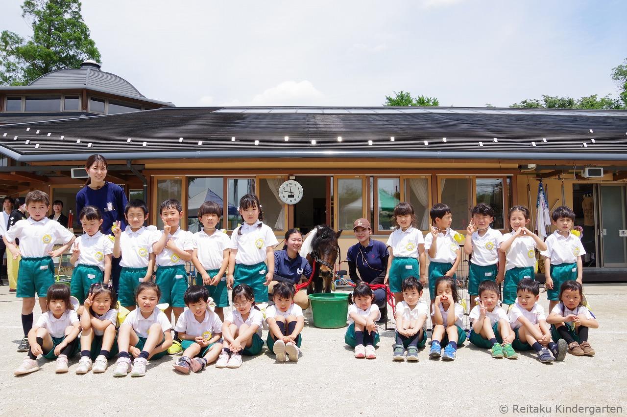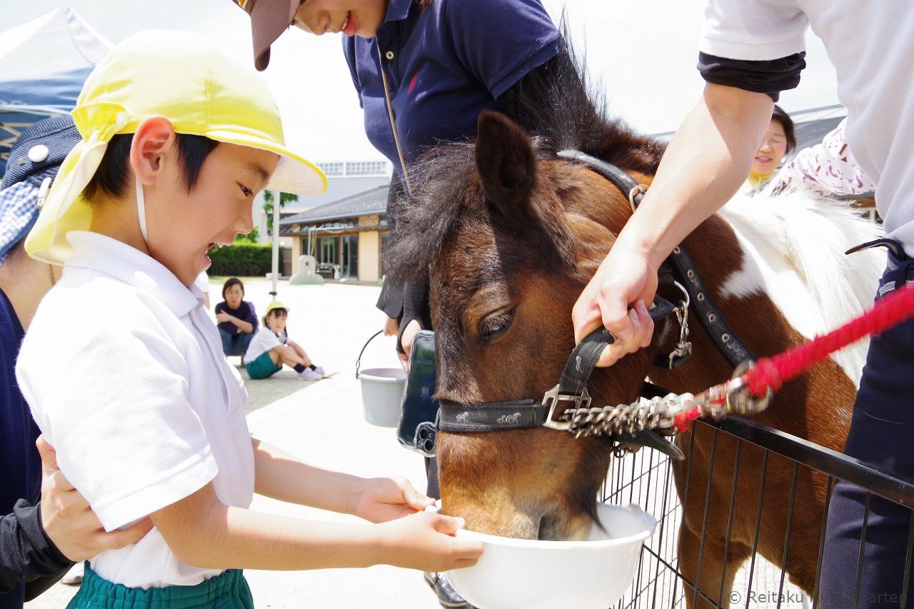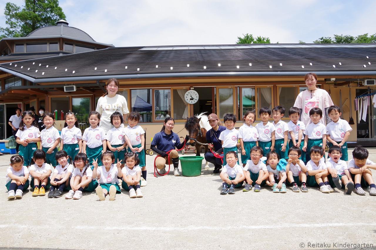 5月21日(火)幼稚園の子どもたちが、学園内で飼育しているポニーとのふれあい体験を実施しました。今回の体験は麗澤大学馬術部に協力いただき、馬場を併設する麗澤大学のキャンパスを生かし、幼稚園児にとって身近に触れることのできないポニーとの接触を通じて、生き物への愛情や思いやりを育む機会として今回のイベントを実施しました。