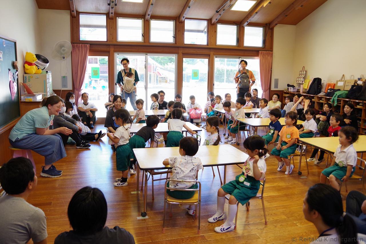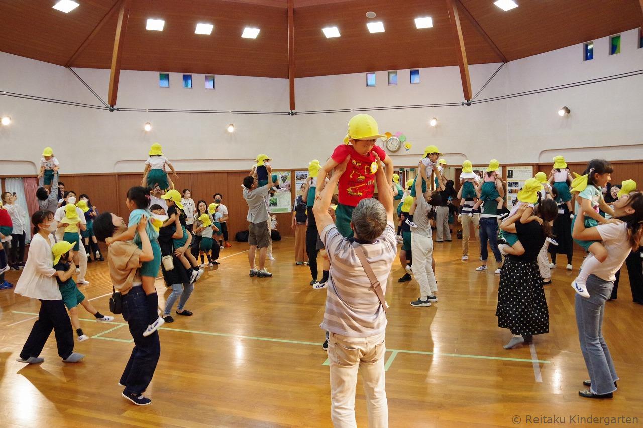 親子一緒に登園し、そのまま教室に入りました。今日は、お母さんやお父さん、おうちの方と一緒ですので、いつもと違って子どもたちはとてもうれしそうです。登園後の自由遊びから朝の会、主活動等の半日の保育の流れをゆっくり参観していただきました。