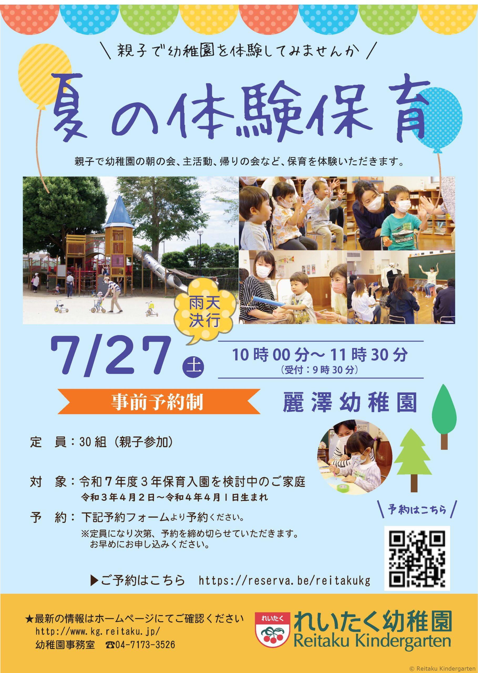 2025年度からの麗澤幼稚園への入園を検討されているお子様向けに幼稚園の実際の保育を体験いただくことを目的として、下記の通り「夏の体験保育」を実施いたします。