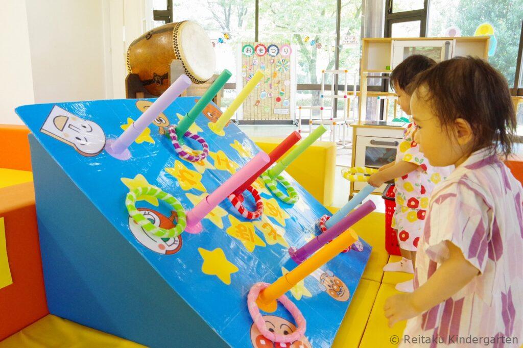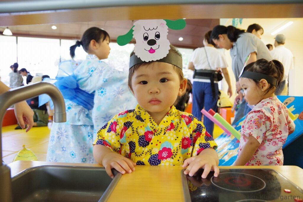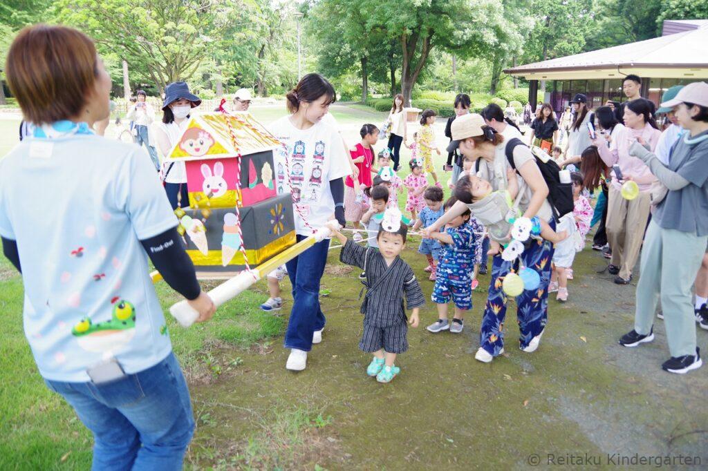 あいあい祭は、0歳から2歳の未就園児の方を対象として、子ども達に少しでも夏祭りの雰囲気を体験してほしいという思いから実施を致しました。計90組ほどの方々が来場され、会場は大賑わいでした。いつものあいあい会場内は、提灯やお神輿などお祭り飾りで装飾され、お祭りムード一色です。ヨーヨーすくい、キャラクターお面、おさかなつりコーナー、輪投げなども準備され、子ども達も夏祭りごっこを楽しんでいました。お祭の後半ではお神輿担ぎも行われ、先生達が担いだ神輿を「わっしょい!わっしょい!」の掛け声とともに見守りました。