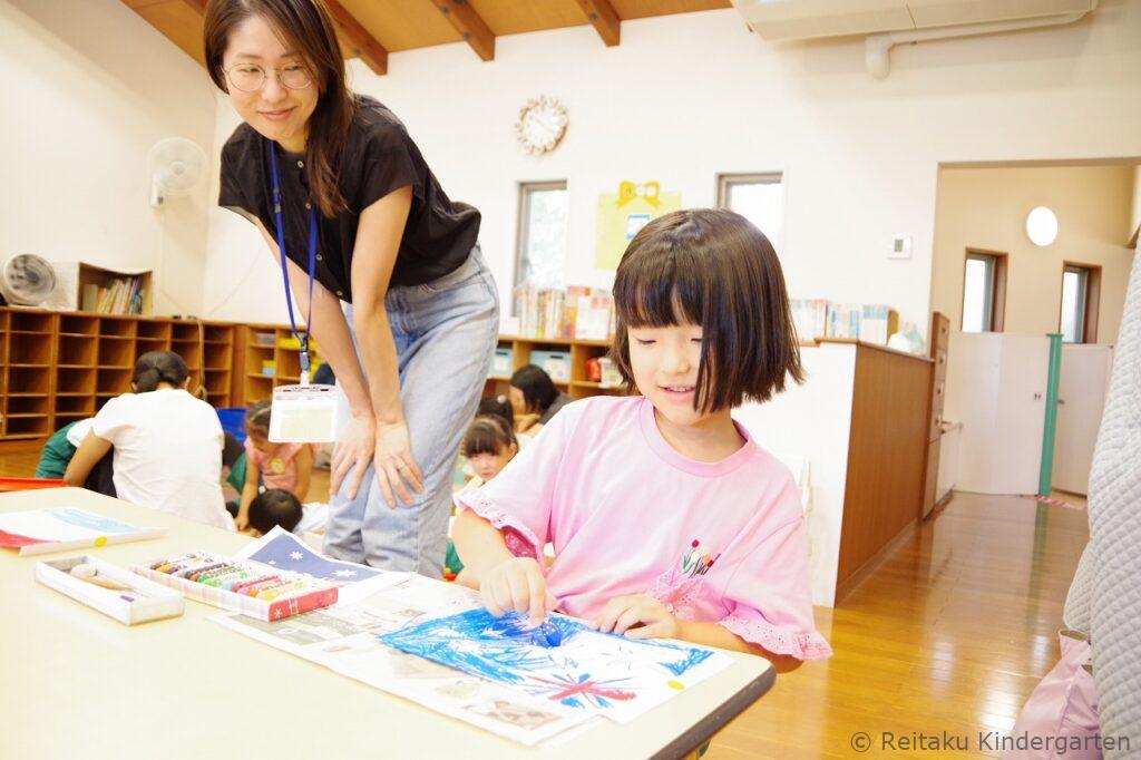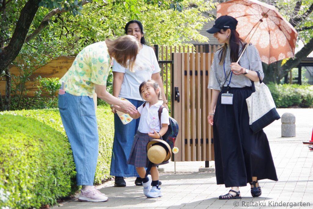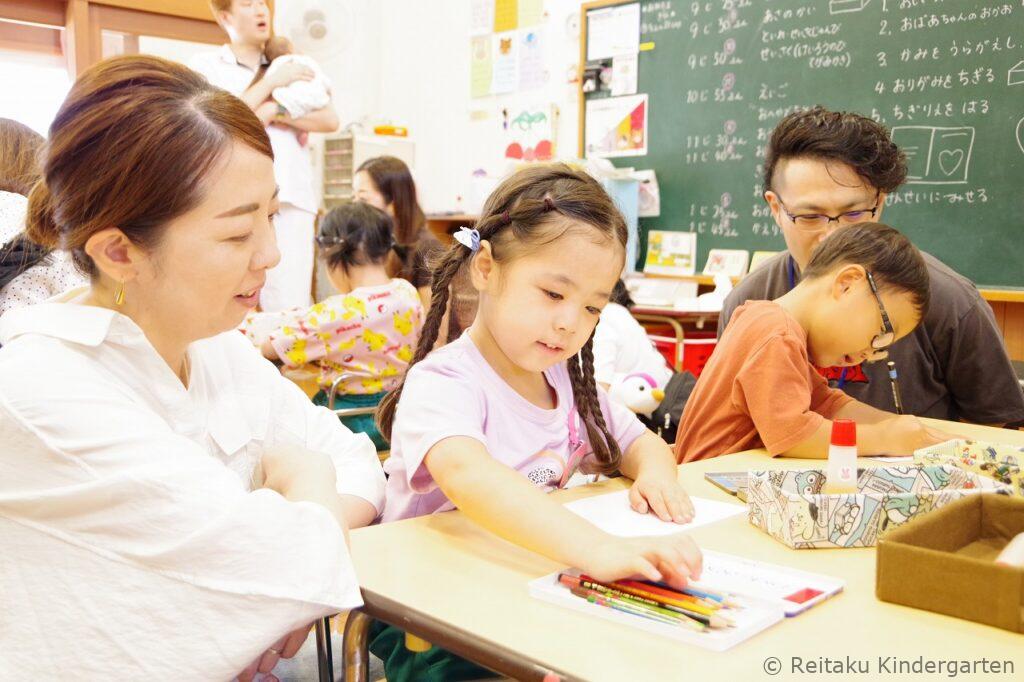 親子一緒に登園し、そのまま教室に入りました。今日は、お母さんと、あるいはお父さんと一緒ですので、いつもと違って子どもたちはとてもうれしそうです。登園後の自由遊びから朝の会、主活動等の半日の保育の流れをゆっくり参観していただきました。
