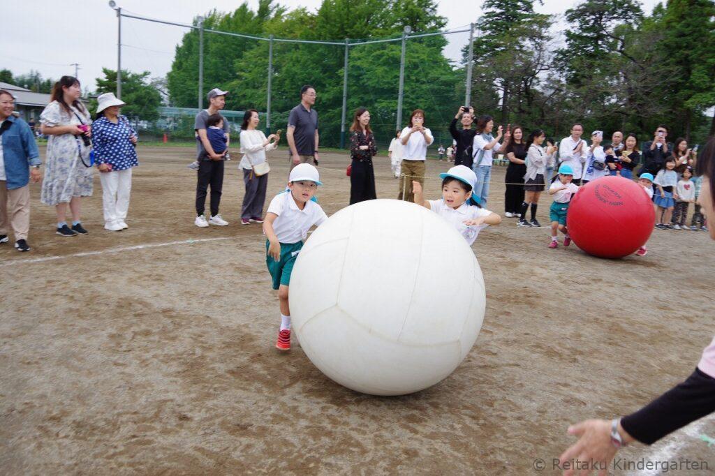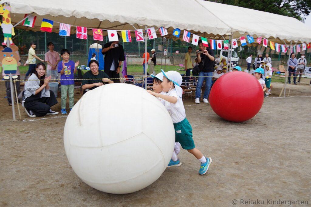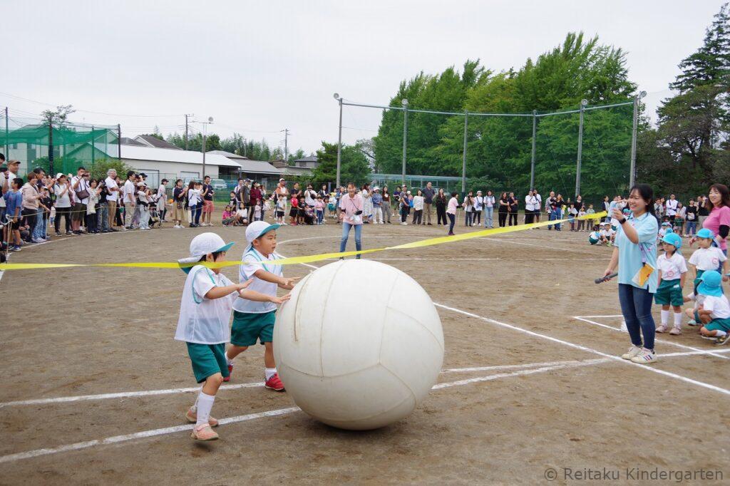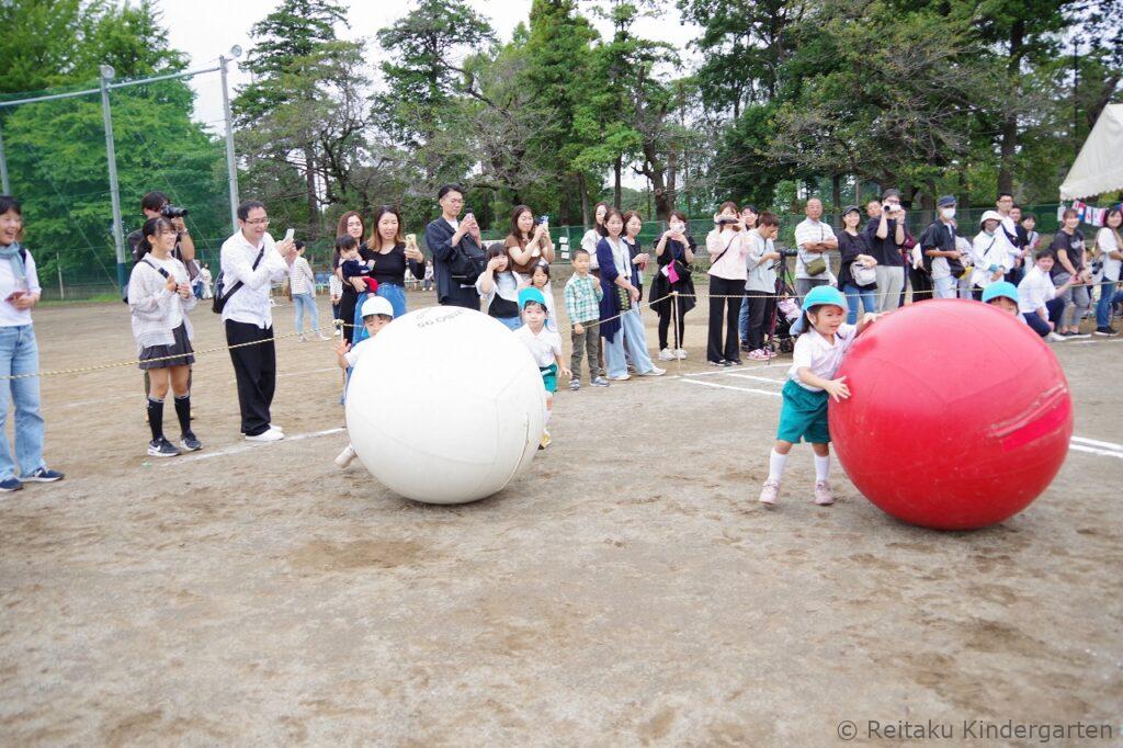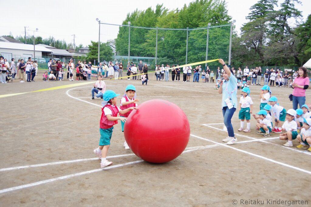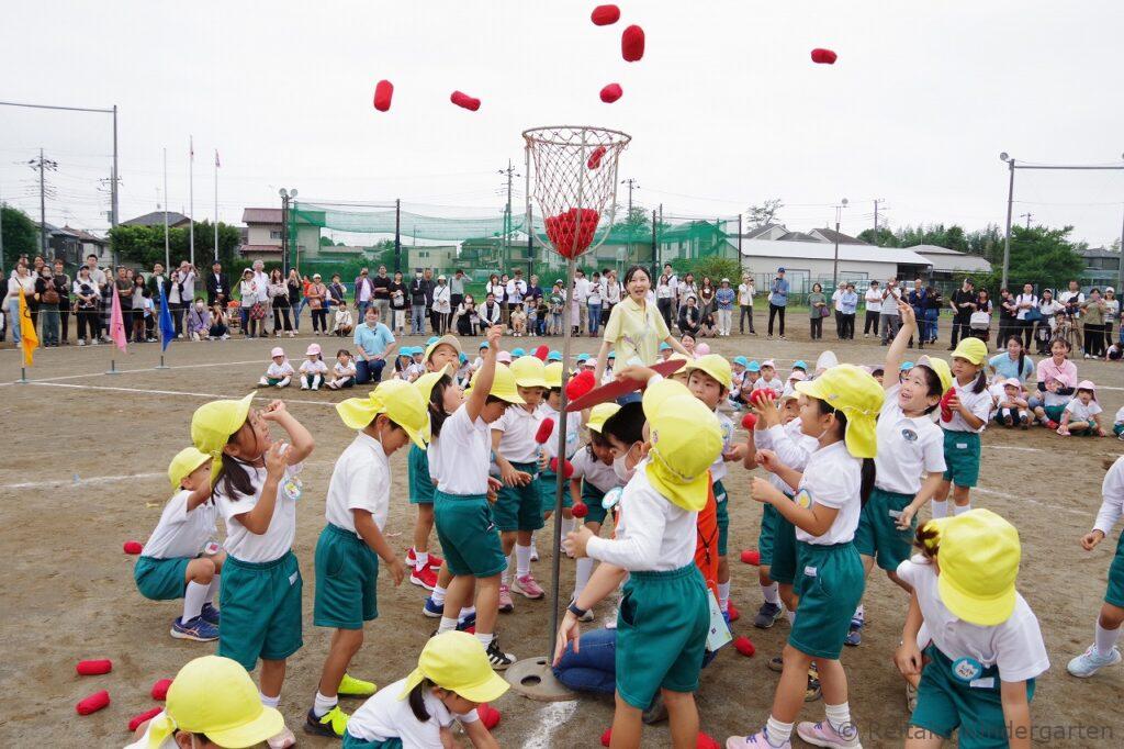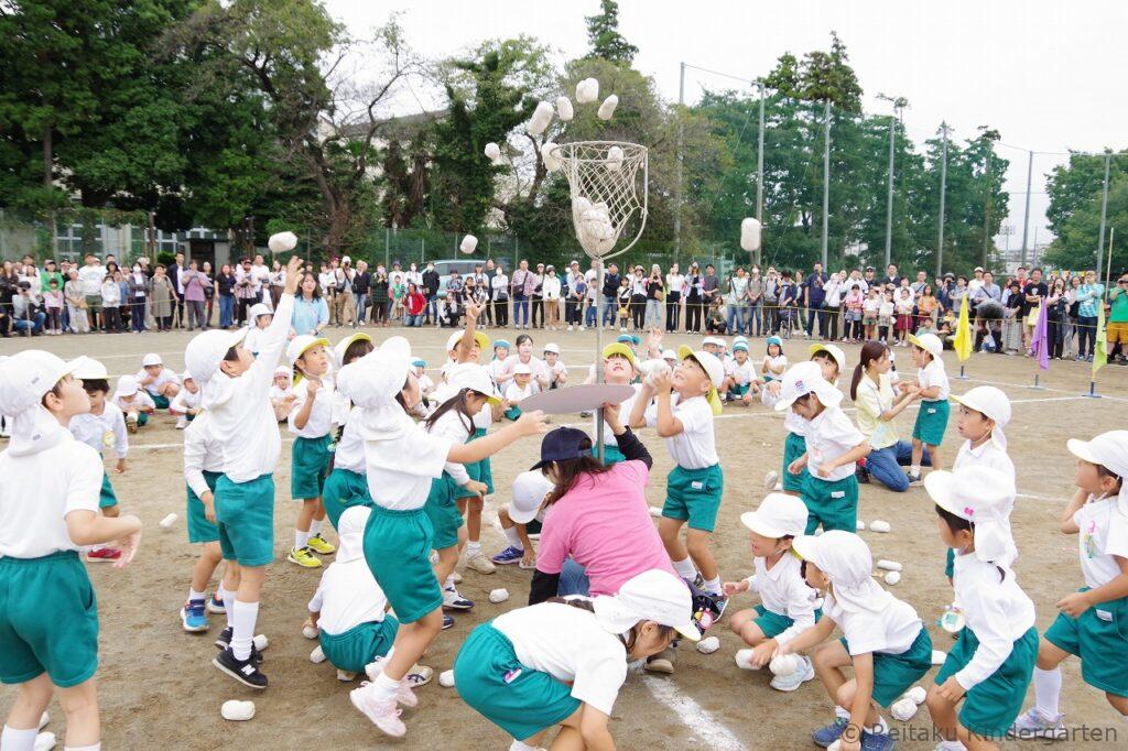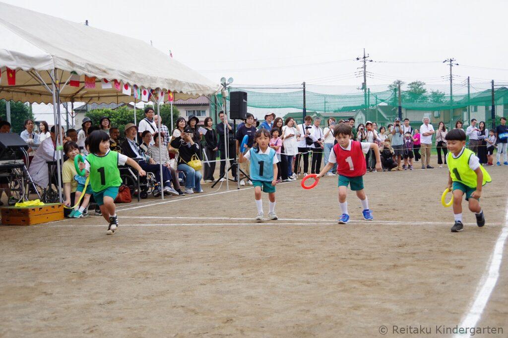 お父さん、お母さん、おじいちゃん、おばあちゃんを始めとして家族の皆さんが応援に駆けつけ、張り切る子ども達。学年ごとにかけっこ、全学年で玉入れ、年少組はお遊戯、年中組はバルーン、大玉転がし、年長組は旗体操とリレー、綱引きが行われました。