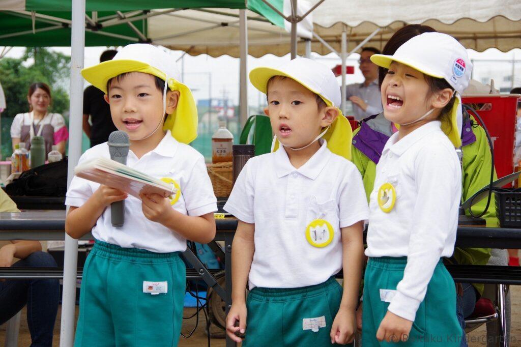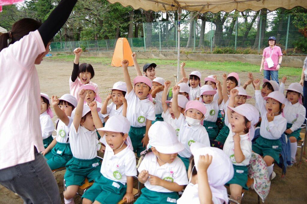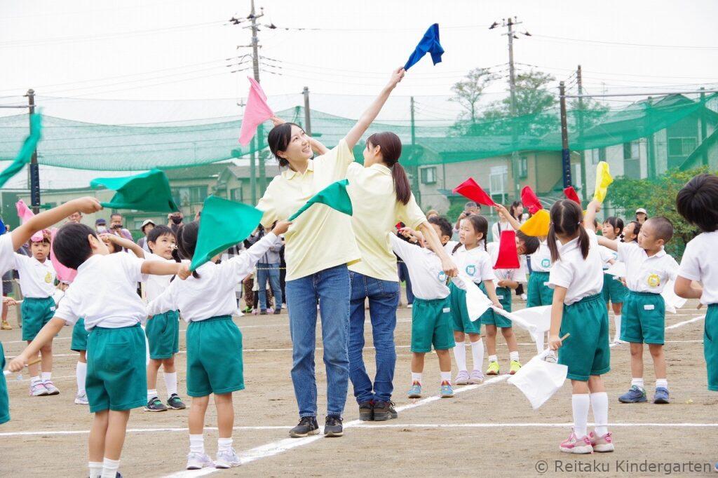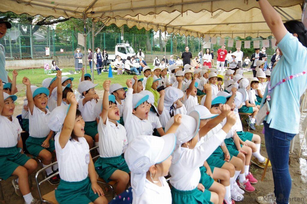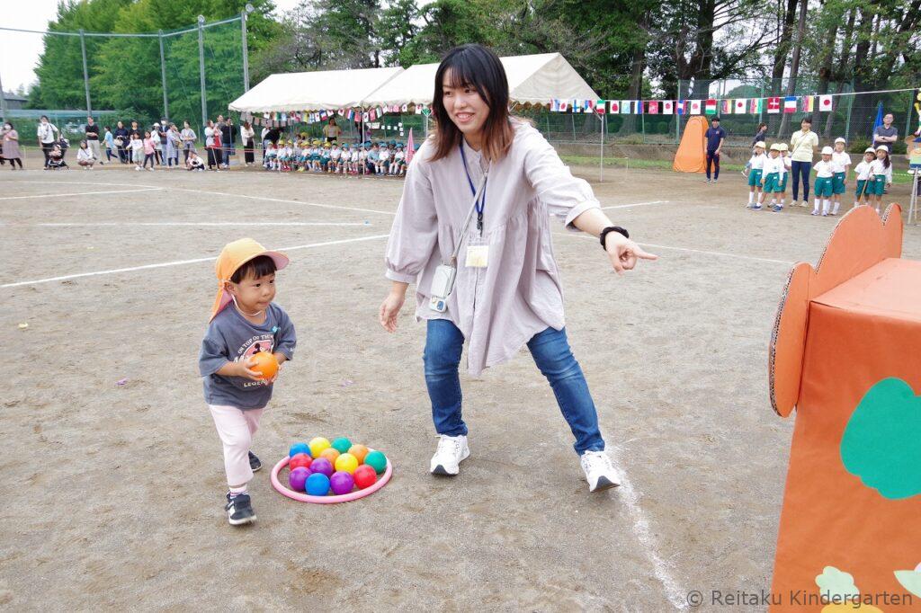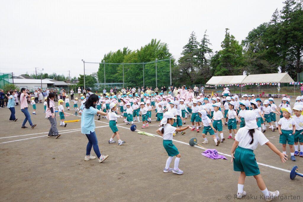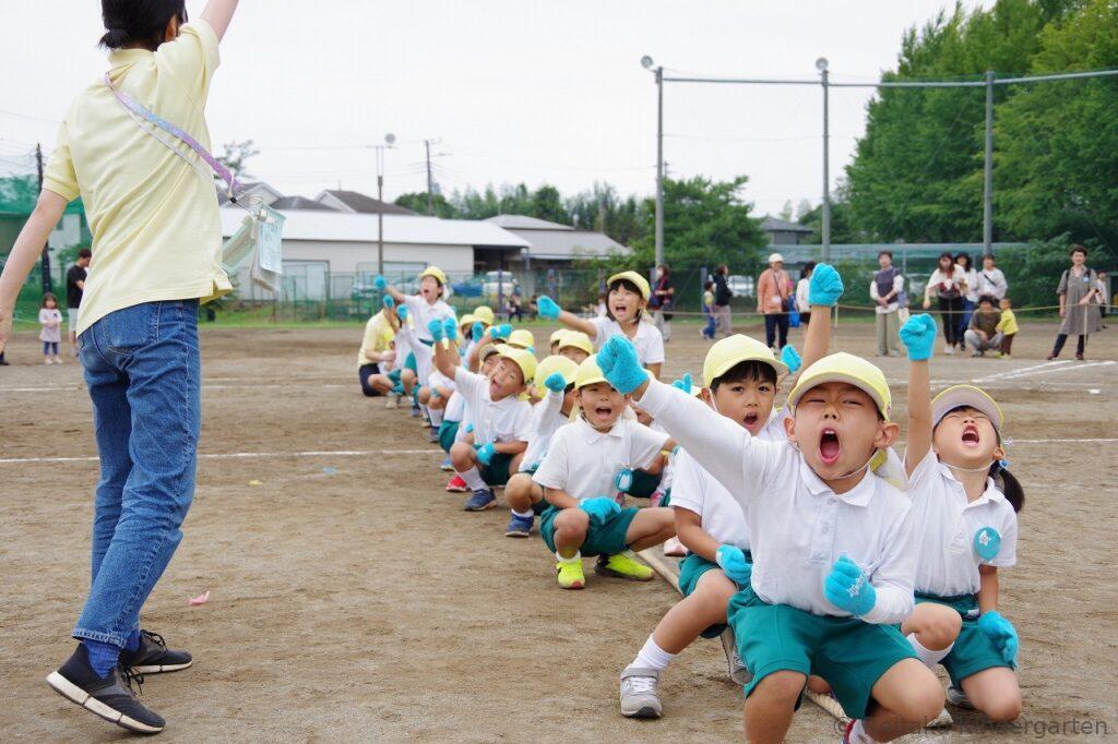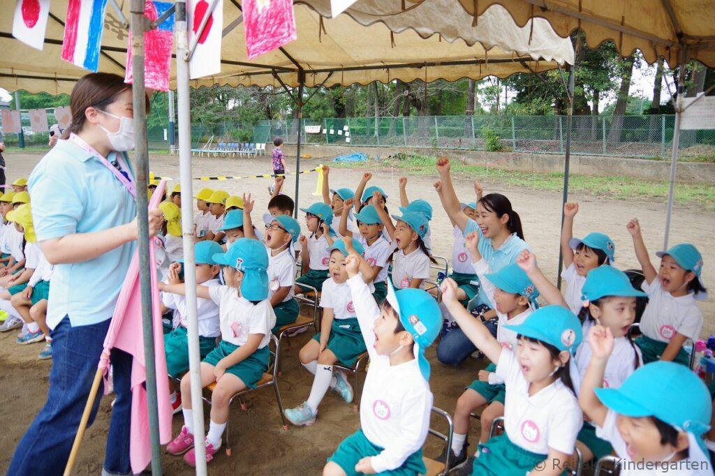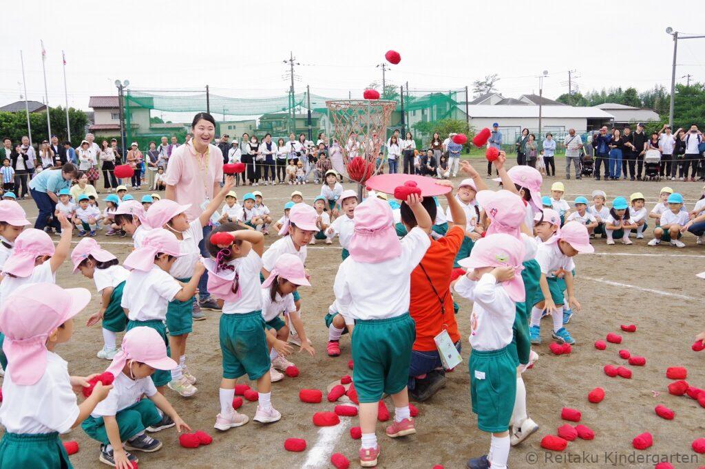 お父さん、お母さん、おじいちゃん、おばあちゃんを始めとして家族の皆さんが応援に駆けつけ、張り切る子ども達。学年ごとにかけっこ、全学年で玉入れ、年少組はお遊戯、年中組はバルーン、大玉転がし、年長組は旗体操とリレー、綱引きが行われました。