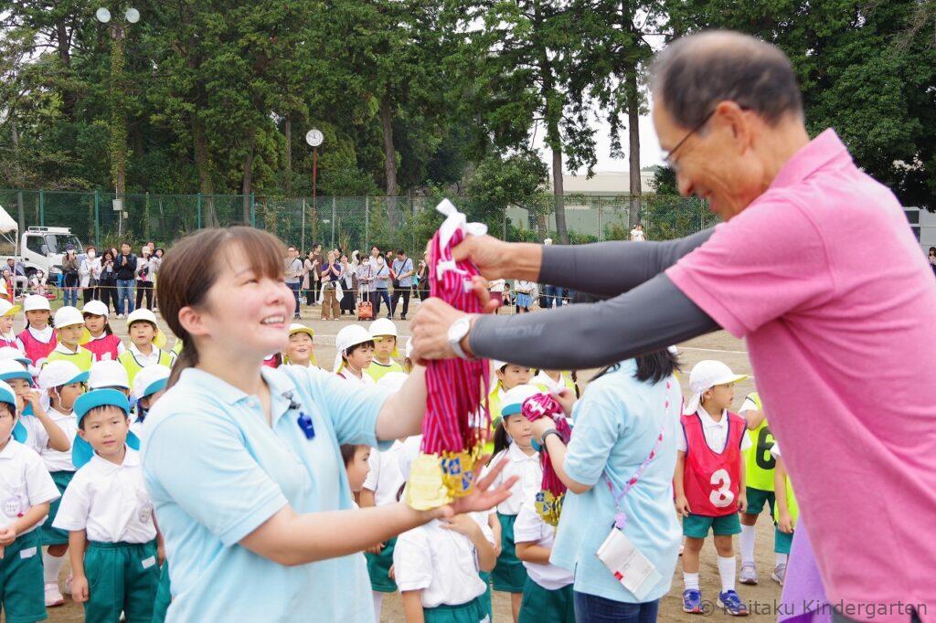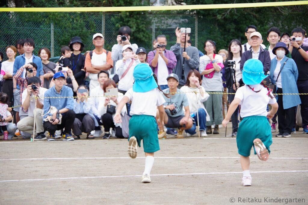 お遊戯では子ども達の入場から、バルーンでは、技が決まるたびに、旗体操では、子どもたちの凛々しい姿に保護者の方々も感動され、沢山の拍手をいただきました。最後に年長さんのクラス対抗リレー競争が行われ、会場全体が追いつ抜かれつの競り合ったレースにより、大きな歓声につつまれました。