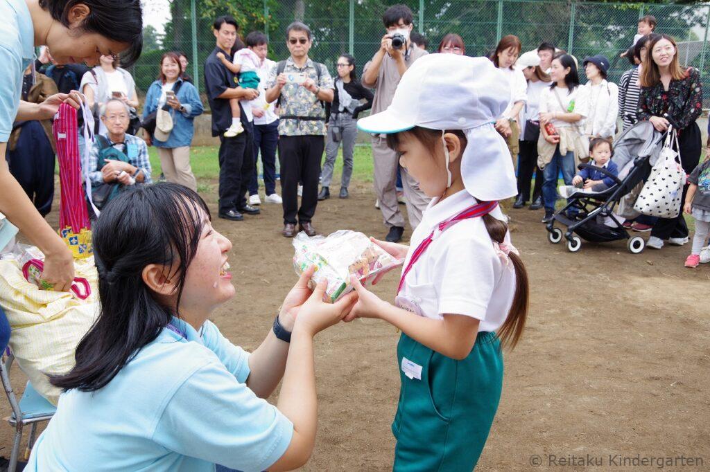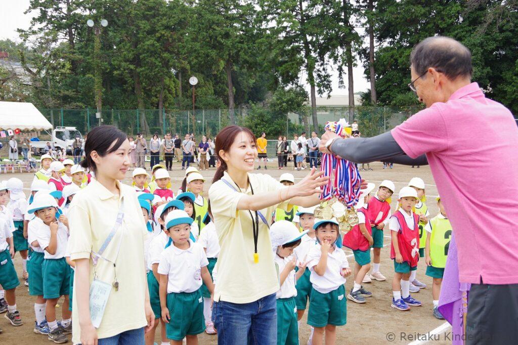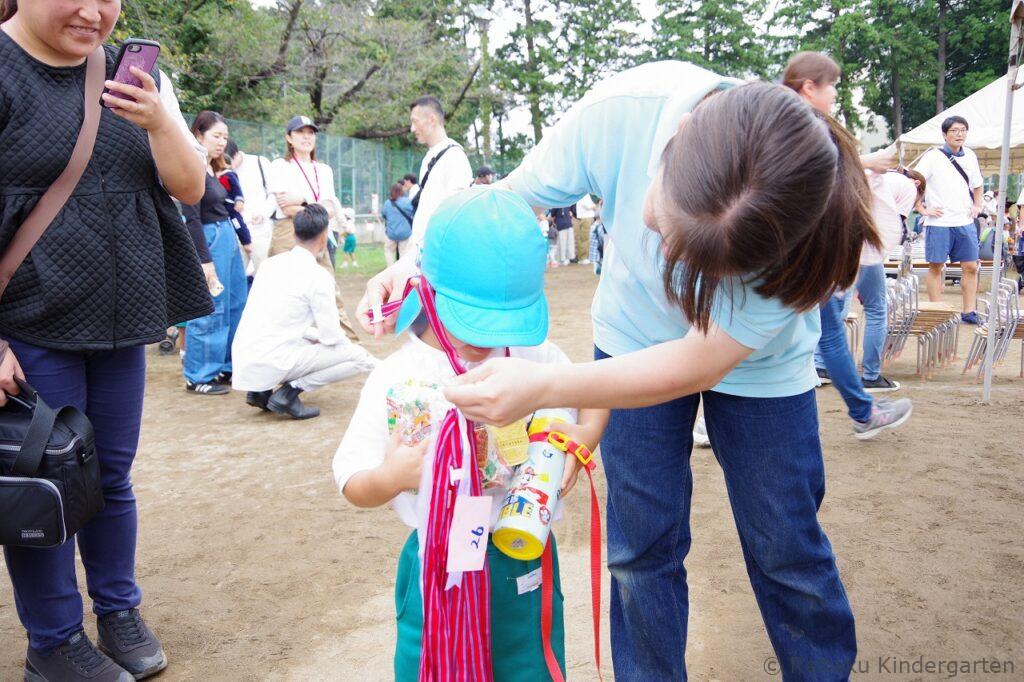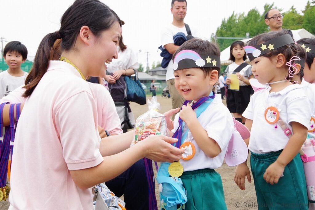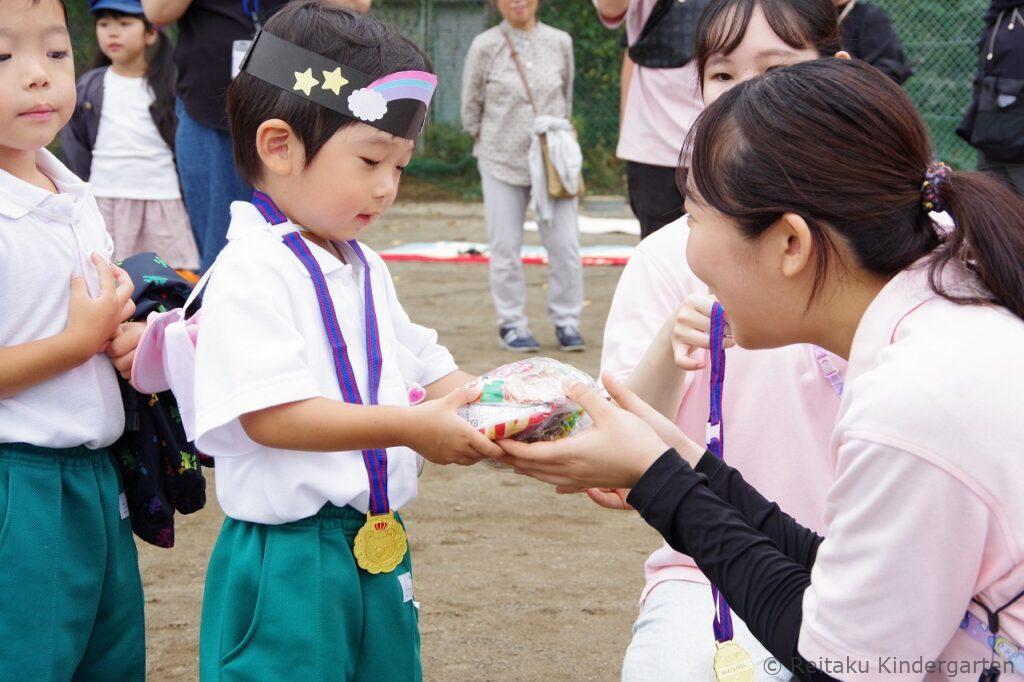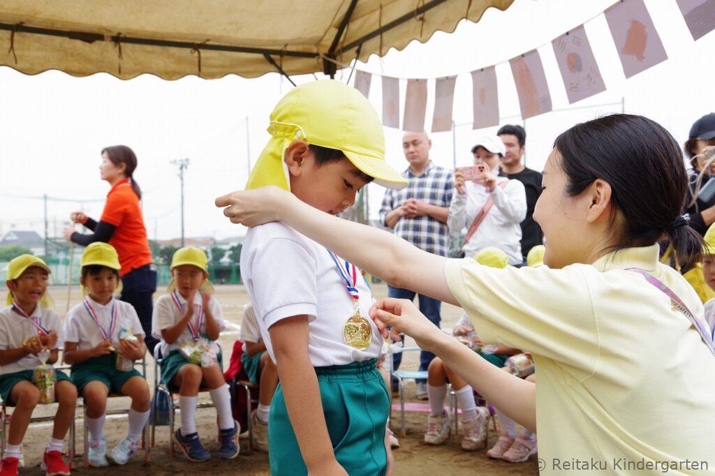 園児たちは、先生より頑張ったご褒美に、全員ピカピカの金メダルをもらってとてもうれしそうでした。どの子も誇らしげに胸にかけて、それぞれ帰宅しました。