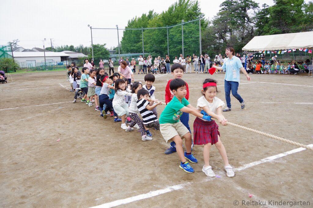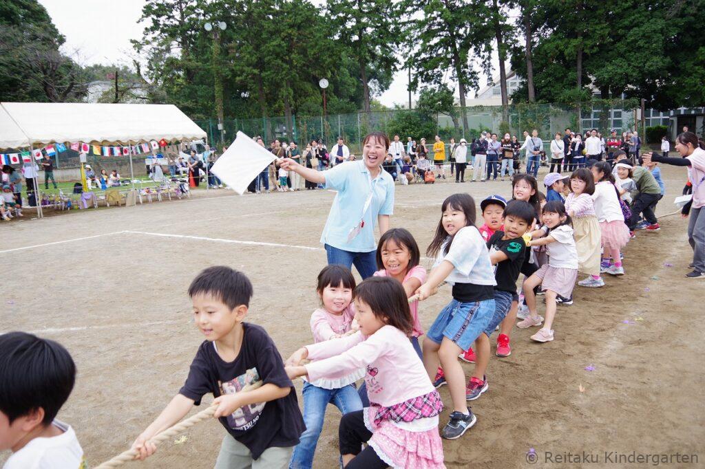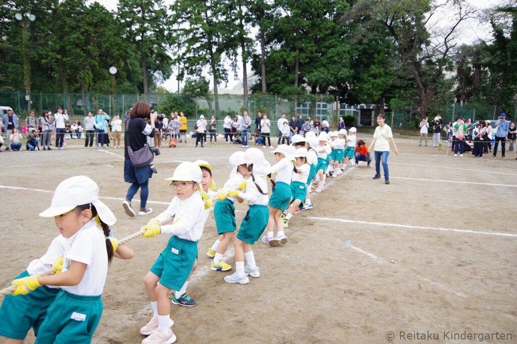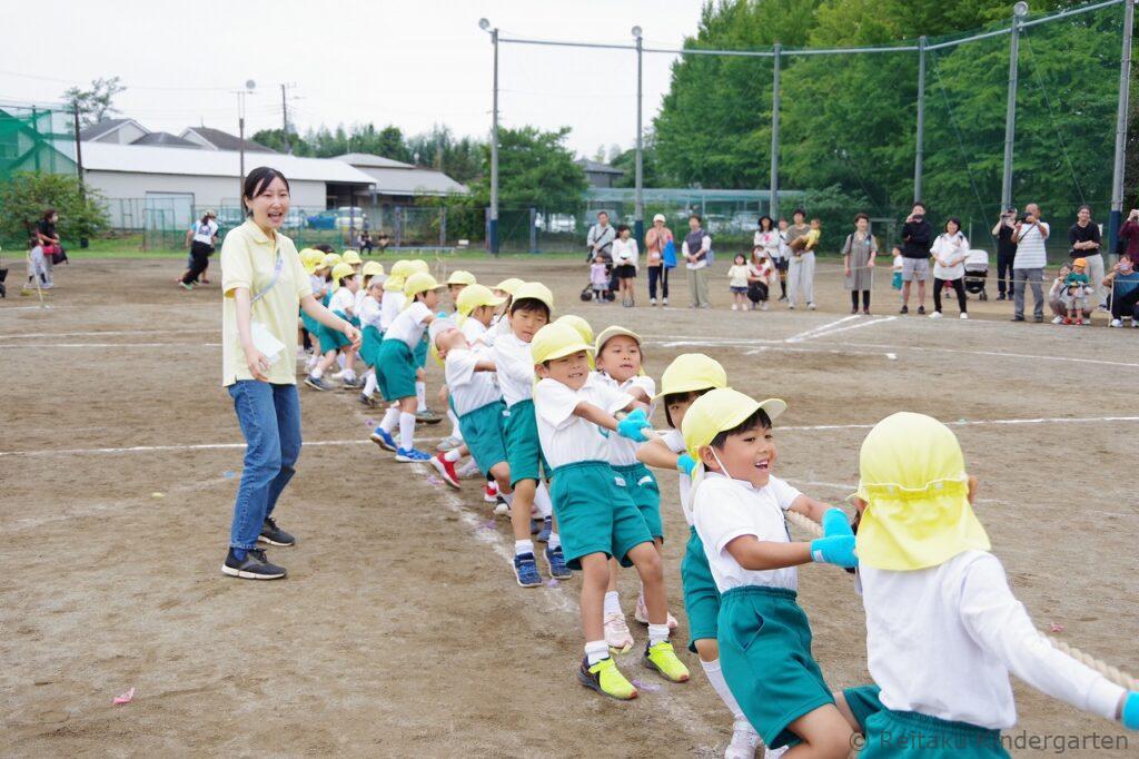 未就園児のお友だちや満3歳児保育りんご組やみかん組のお友だちは保護者の方々と一緒にかけっこを行い、卒園児のお兄さんお姉さんによる綱引きも行われました。
