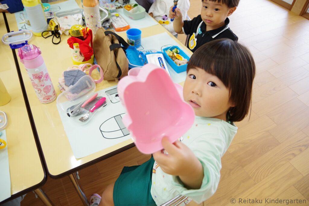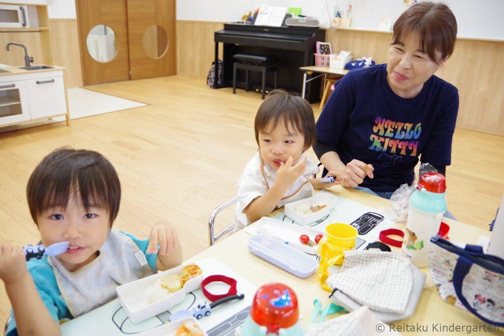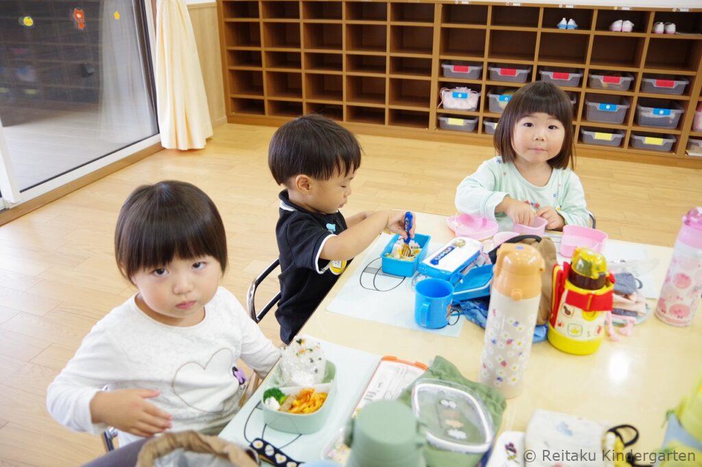 10月8日(火)、9月からスタートした満3歳児みかん組・りんご組のお友だちにとって初めてのお弁当の時間がありました。