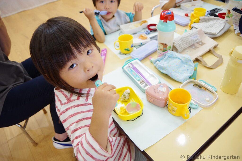 大急ぎでほおばる子やゆっくりと時間をかけて食べる子など、自分たちのペースではありましたがそれぞれにおうちの方に作っていただいたお弁当を味わっていました。