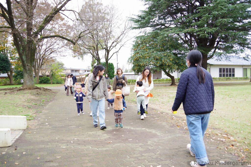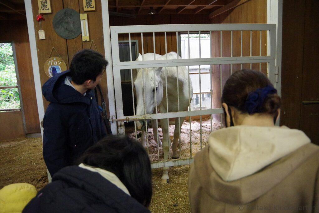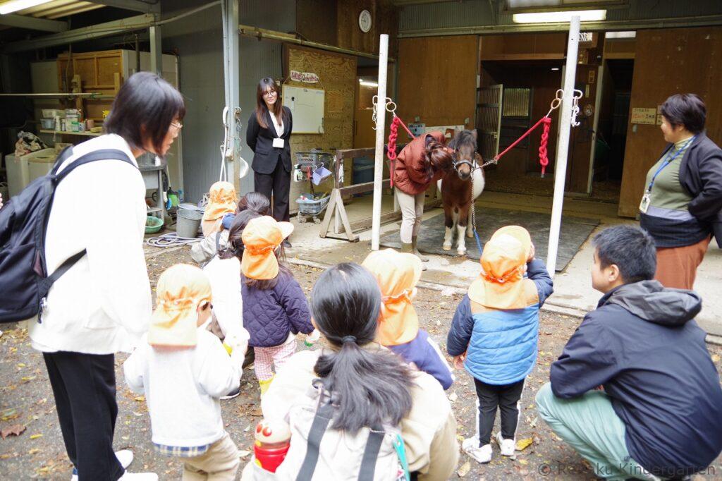 保護者の方と手をつないで、馬房まで出発です。歩いて5分ほど紅葉が進むキャンパス内を散歩しながら向かいました。到着するとすでにポニーのバロンとサラブレッドの白麗(はくれい)がみんなのことを待っていてくれました。怖くて近寄れない子、近くでジーっと見つめる子、ドキドキしながら近づくけれど怖くなってお母さんの後ろに隠れる子等、様々な様子が見られました。