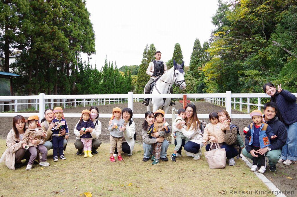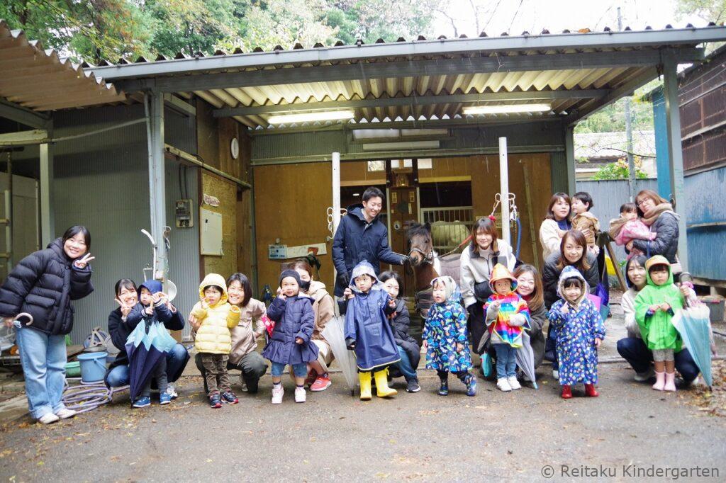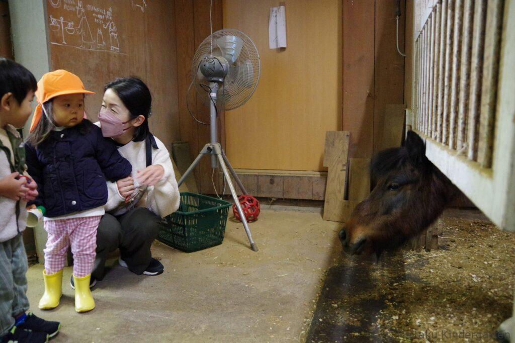 11月18日(月)、20日(水)の2日間、未就園児プレルーム「うさぎルーム親子クラス」のお友達が、園内で飼育しているサラブレッドとポニーに会いに行ってきました!