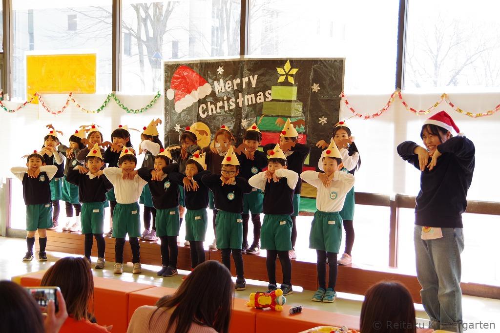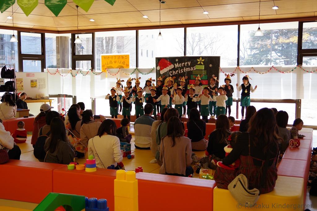今回は、スペシャルゲストとして、麗澤幼稚園の年長組のお友だちが来場し、発表会で歌った歌やクリスマスの歌を披露してくれました。皆でクリスマスにまつわる手遊びや歌を一緒に歌って楽しんでいると、突然サンタさんが登場して、子どもたちもびっくりです!