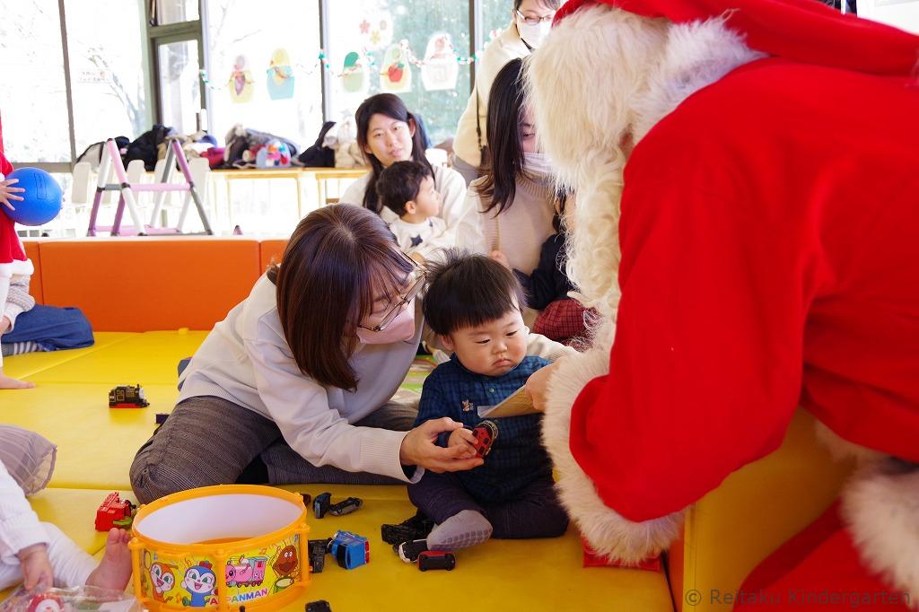 サンタさんから1人1つずつプレゼントをもらってクリスマス会は終了です。サンタさんからもらったプレゼントを大事そうに抱えながら帰っていく子ども達、楽しんでもらえたかな?2024年のあいあいの活動は今日で終了です。今年も沢山の方々にご来園いただき、ありがとうございました。