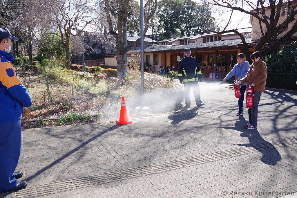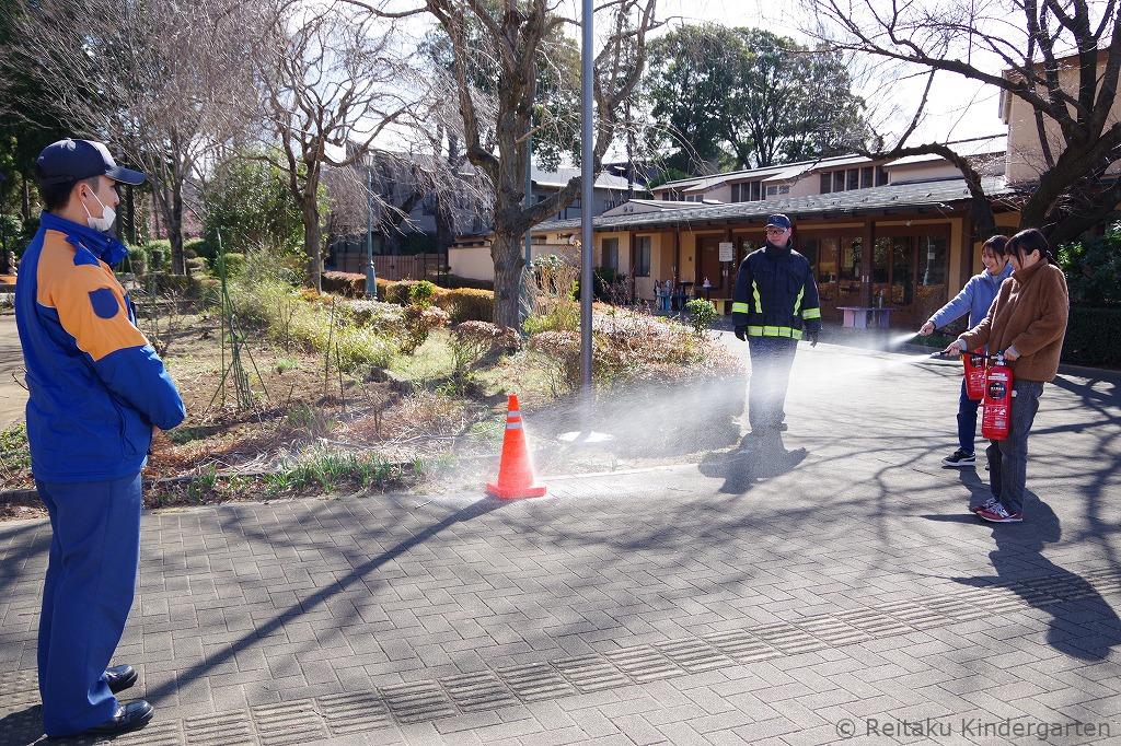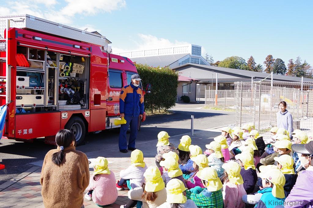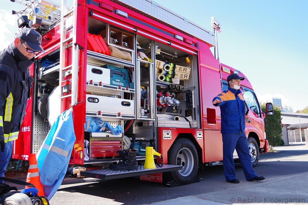 当日は消防車が幼稚園と子育ての森どんぐり脇に登場し、消防士さんも消防車の前で待っていてくれました。消防車の装備や消防士さんの身に着ける道具などを実際に見せてくれながら、子どもたちにわかりやすく紹介してくれました。消火活動の際に持ち運ぶ道具を実際に持たせてもらってあまりの重さに先生たちもビックリでした。消火器を使用した消火体験もさせていただき、終始とてもやさしい消防士さんが対応してくださり、子ども達が事前にしていた質問にも丁寧に答えてくれました。